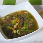 Ihr wisst, dass ich Suppe einfach nicht vernünftig fotografieren kann… wisst ihr doch – oder? Es hilft einfach nix, es wird nicht besser. Ich habe zwar auch ein paar hübsche Suppen-Fotos, aber die Chancen stehen jedes mal 50/50. Normalerweise rette ich mich dann wenigstens mit einem spannenden Rezept – aber hier ist es ein ganz einfaches Resteessen aus der 5 Minuten Kategorie. Das liegt jetzt auch schon ewig vorbereitet bereit um mal gepostet zu werden, aber dann gibt es halt doch immer wieder Rezepte mit hübscheren Fotos. Jetzt hat Mel von Pimpimella bei Zorra ein Event zum Thema „Outtakes from your kitchen“ gestartet. Da kann ich die Suppe endlich und ohne schlechtes Gewissen mit euch teilen – ist ja für ein Event! 😉 Ich hatte vom Tafelspitz und von den Maultaschen mit Tafelspitz noch gut 1 L Rindersuppe übrig, aber keinen Platz mehr im Tiefkühler um die Suppe einzufrieren. Zum Wegwerfen war sie viel zu schade, also gab es diese Restesuppe. Egal, geschmeckt hat’s… auch wenn es vielleicht nicht unbedingt so aussieht.