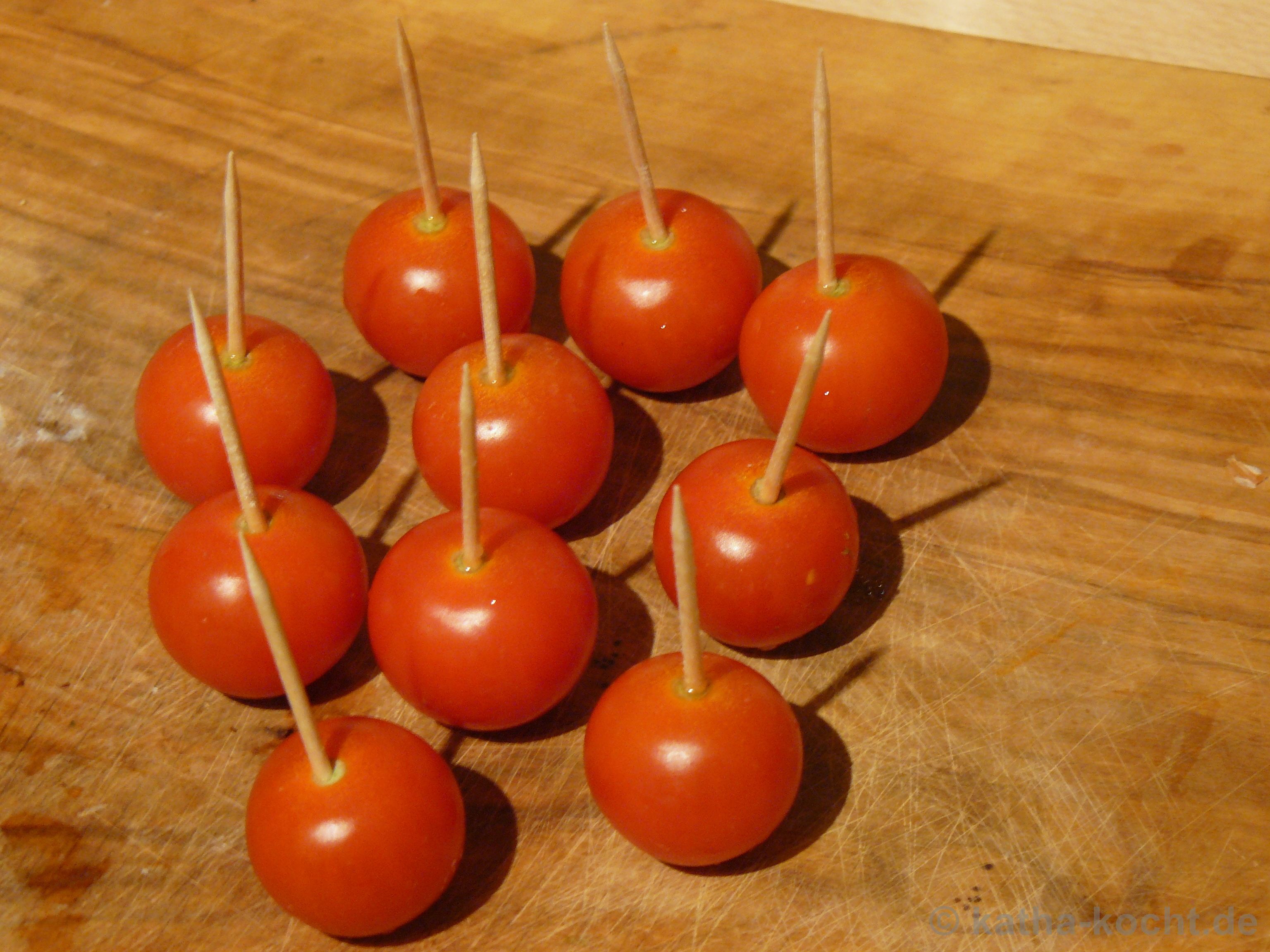 Die Cocktailtomaten werden auf Holzspieße gesteckt.