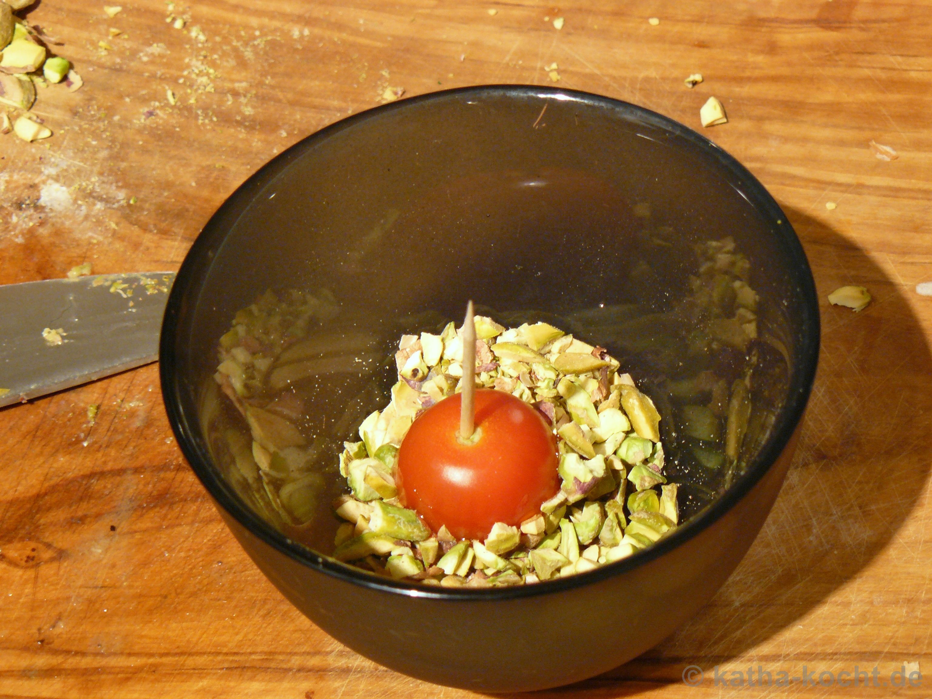 In dieser Zeit gebe ich Zucker und Wasser in eine kleine Pfanne und lasse den Zucker bei geringer Hitze schmelzen. Sobald das Ganze zu einem dicken Sirup geworden ist dippe ich die Tomaten bis zur Hälfte in das Karamell und von dort aus weiter in die gehackten Pistazien. Achtung – das Karamell soll keine Farbe annehmen!