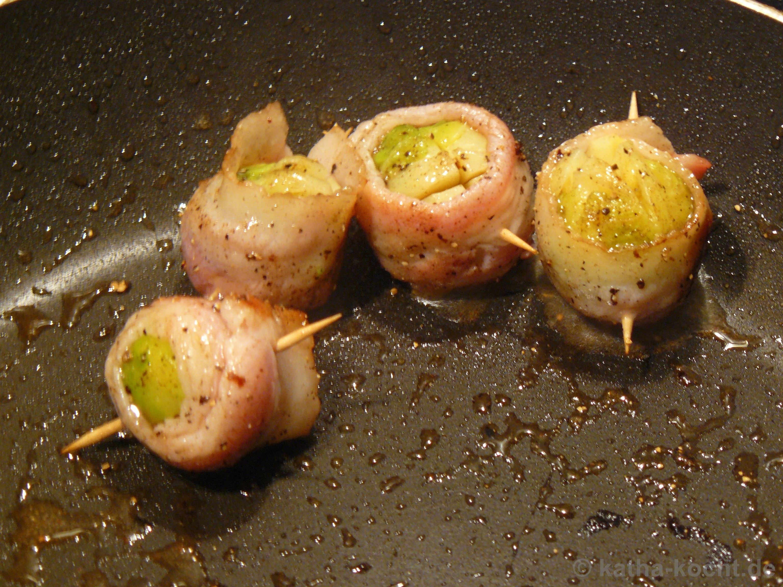 In einer Pfanne erhitze ich etwas Olivenöl und brate die Rosenkohl-Speckpäckchen rundherum an bis der Bacon etwas Farbe angenommen hat. Dabei würze ich mit Pfeffer und Salz.