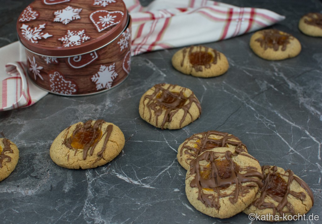 Abwarten bis die Schokolade ausgehärtet ist, dann dürfen die Marmeladentaler mit Kürbismarmelade in die Keksdose. Dort sind sie theoretisch 3-4 Wochen haltbar… aber das kommt bei mir eigentlich nie vor.