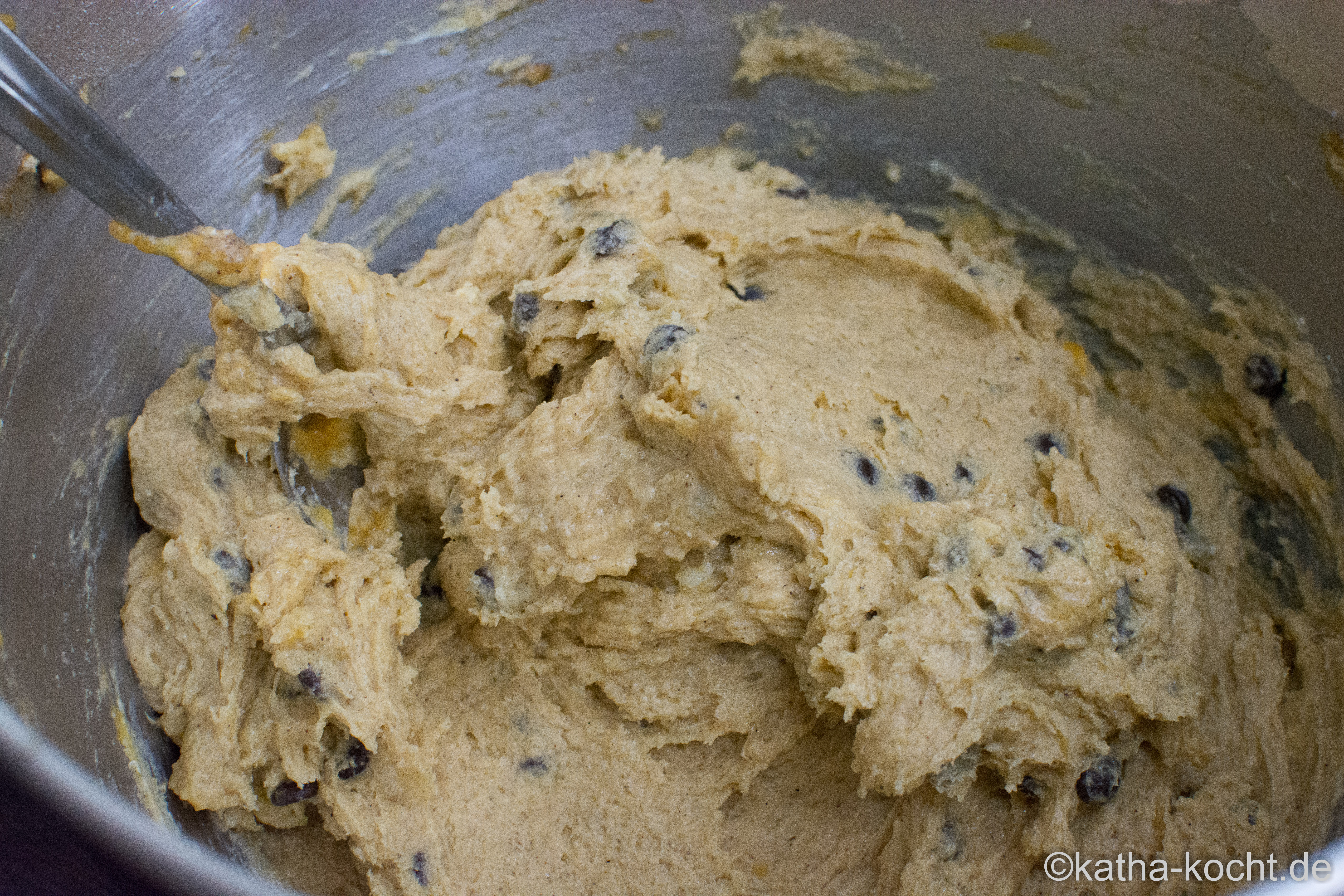 20g von den Schokotropfen beiseite stellen und alle restlichen Zutaten zu einem weichen, klebrigen Teig vermengen.