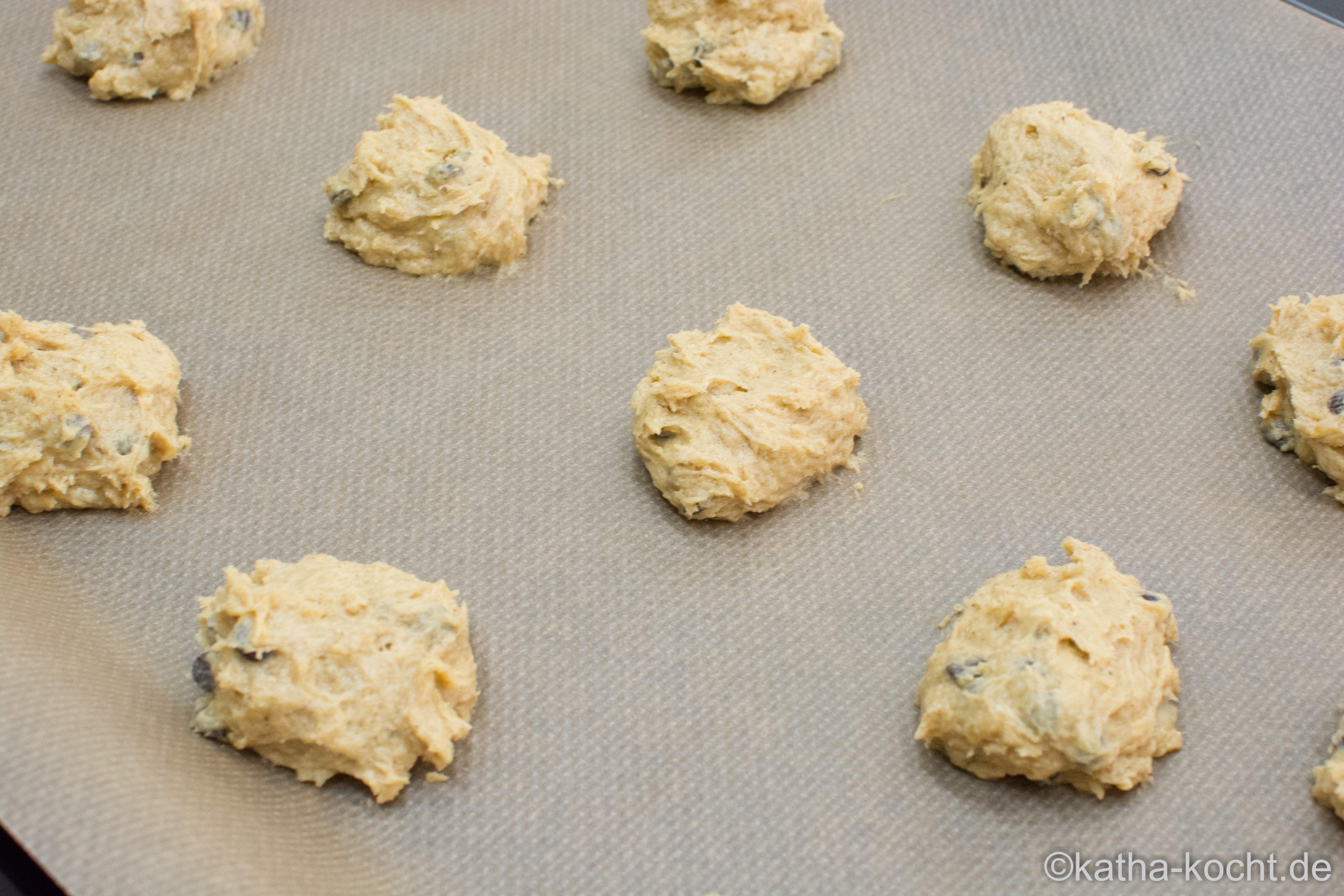 Den Teig mit zwei Esslöffeln oder dem Eiskugelportionierer auf ein Backblech mit Backpapier setzen.