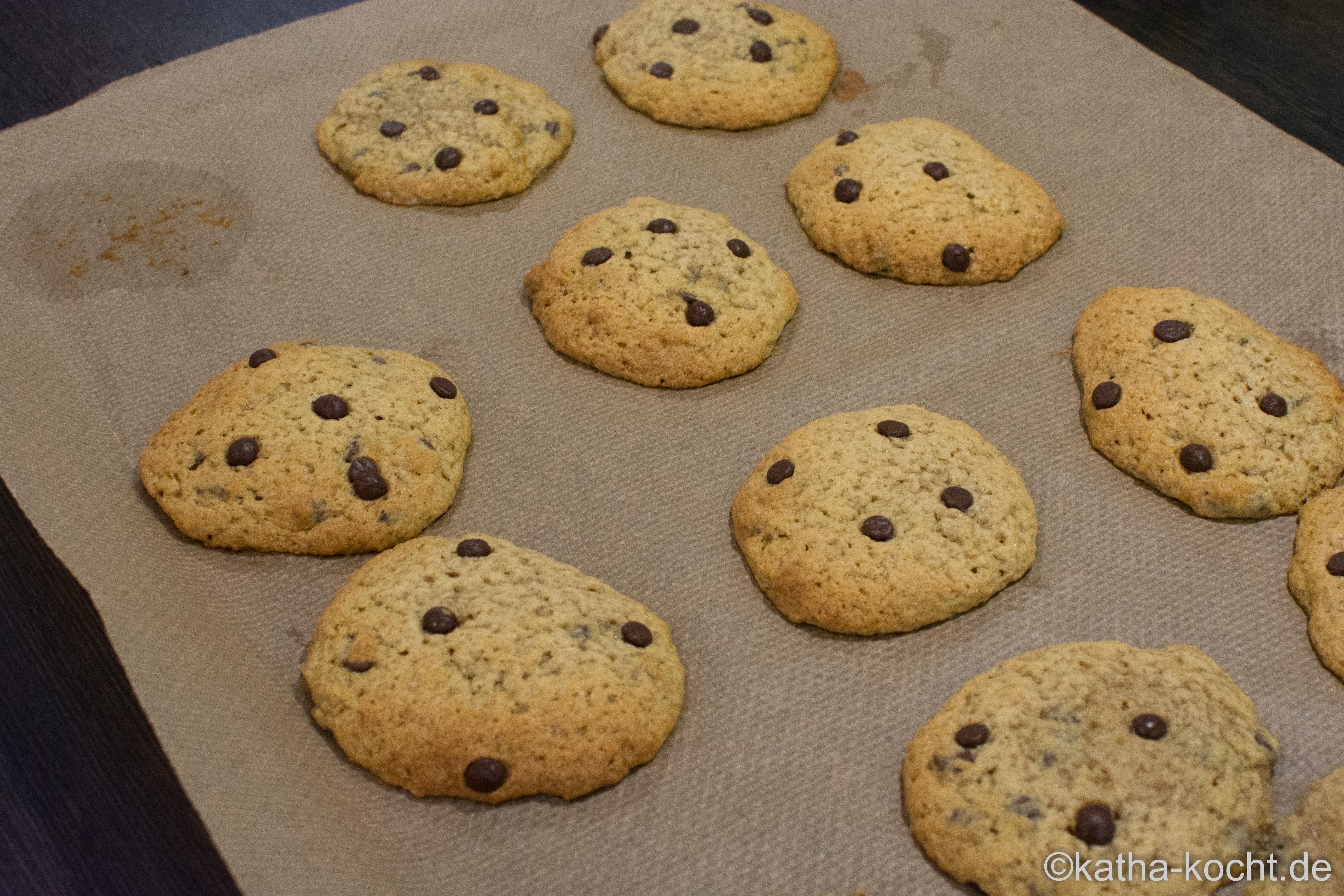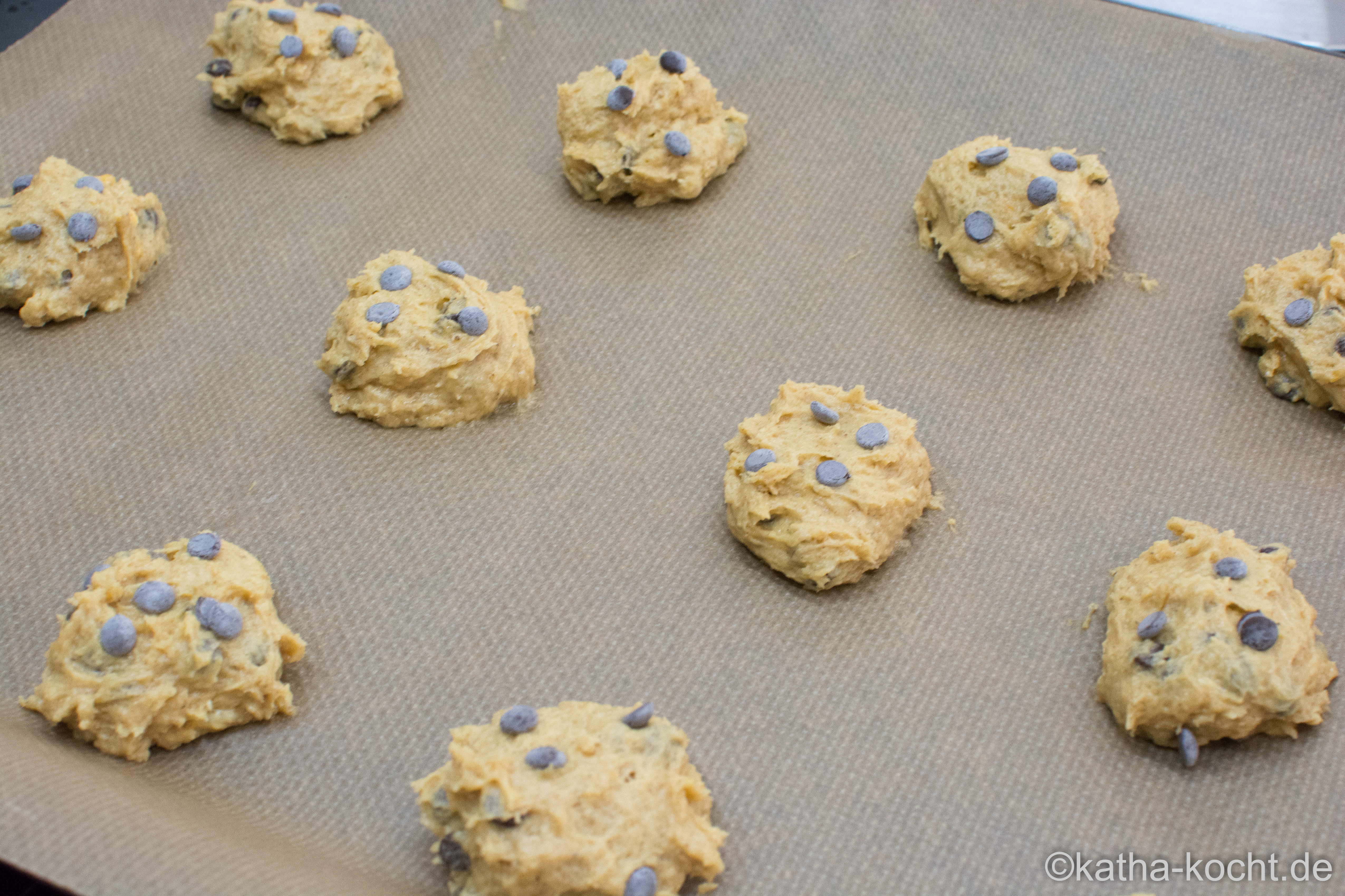 Die restlichen Schokotropfen auf die Cookies verteilen.