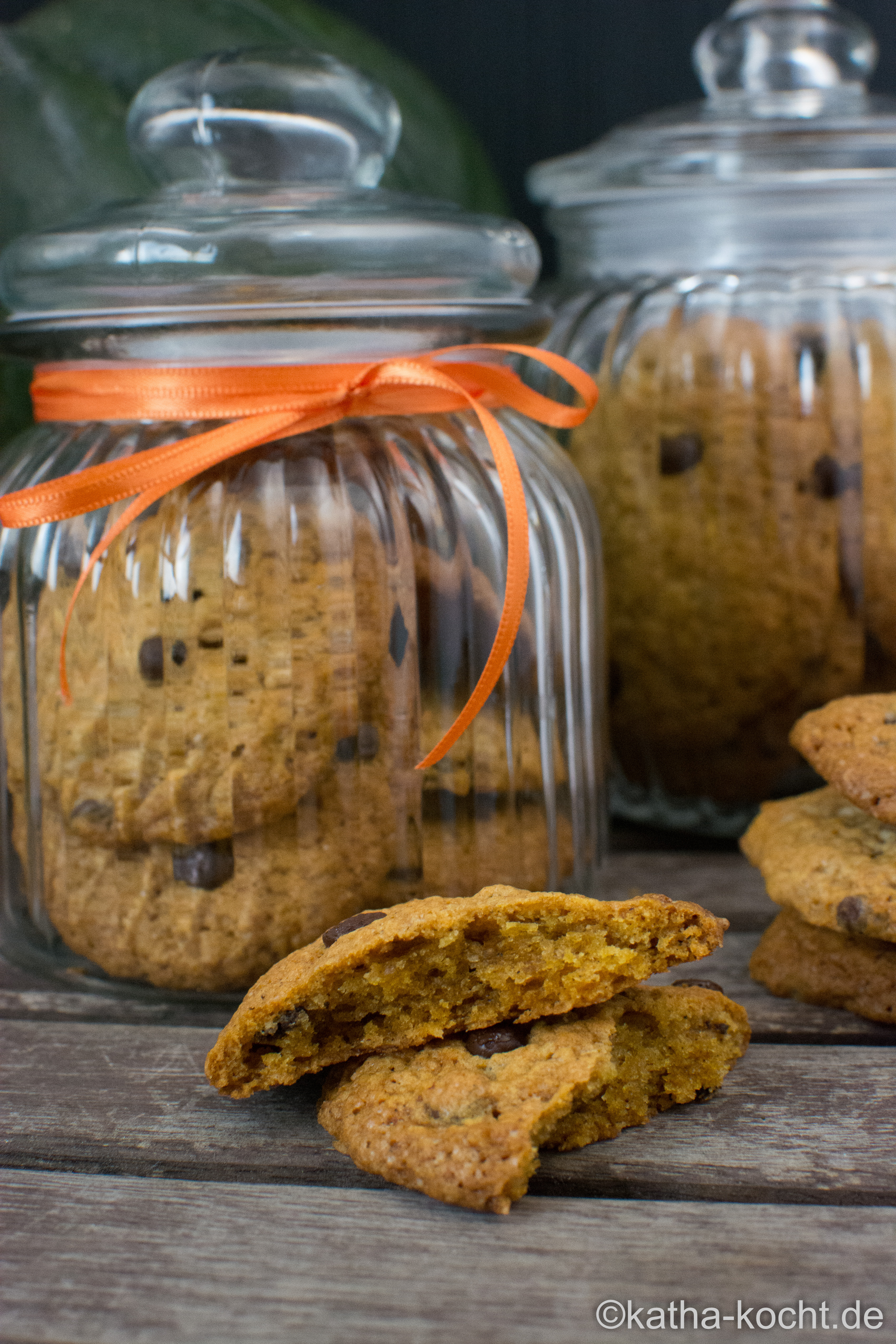 Die Chocolate Chips Kürbis Cookies vollständig auskühlen lassen und dann in eine Keksdose oder ein passendes Glas füllen.