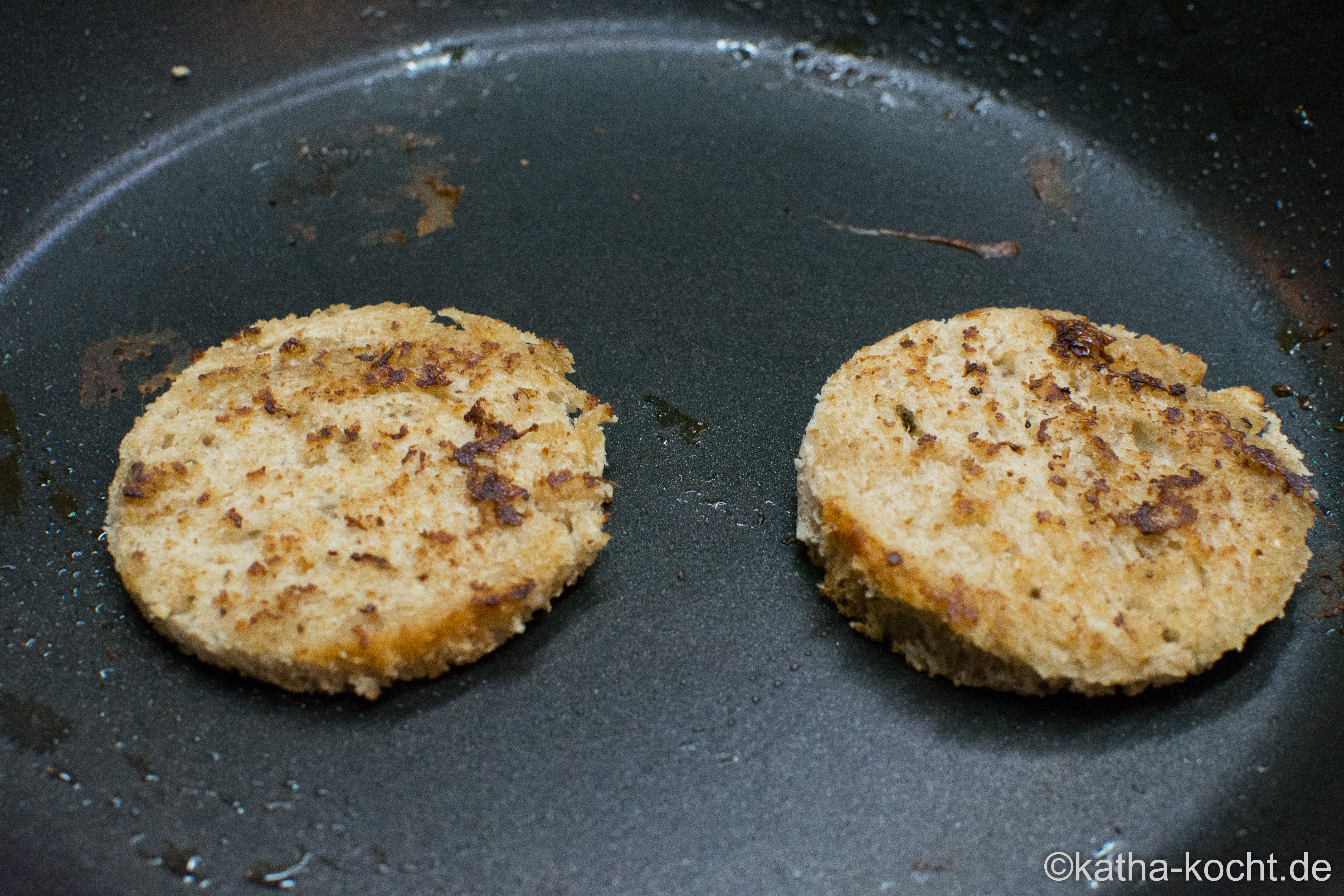 Aus dem Toastbrot zwei Taler ausstechen, das geht am einfachsten mit einem Servierring. Die Toastbrottaler ohne zusätzliches Öl in der Pfanne anrösten in der gerade die Garnelen waren. Dabei ruhig das Öl von den Garnelen mit dem Brot „aufwischen“.