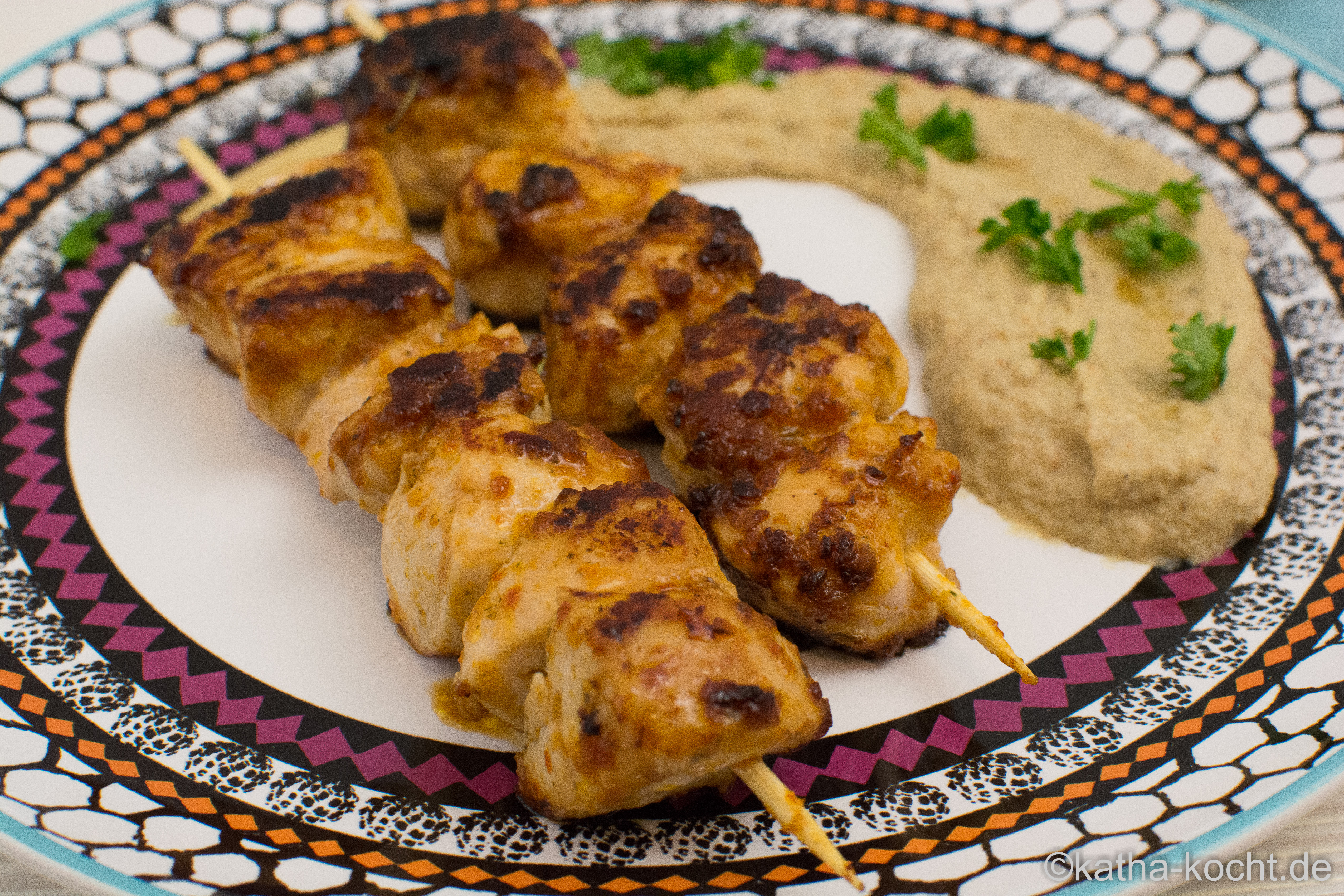 Auberginen Hummus und Hähnchenspieße