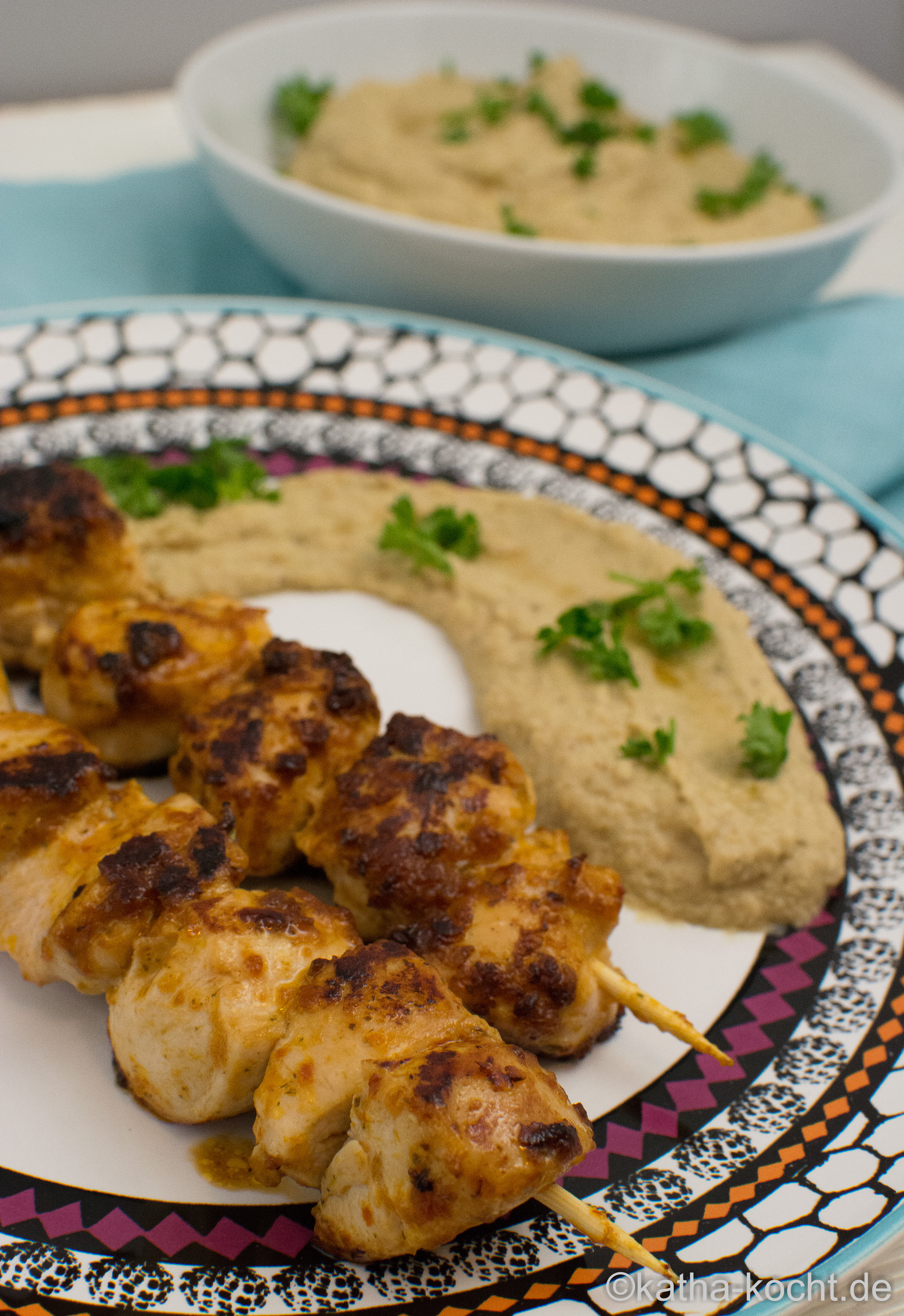 Den Auberginen Hummus zusammen mit den Hähnchenspießen anrichten und sofort servieren.