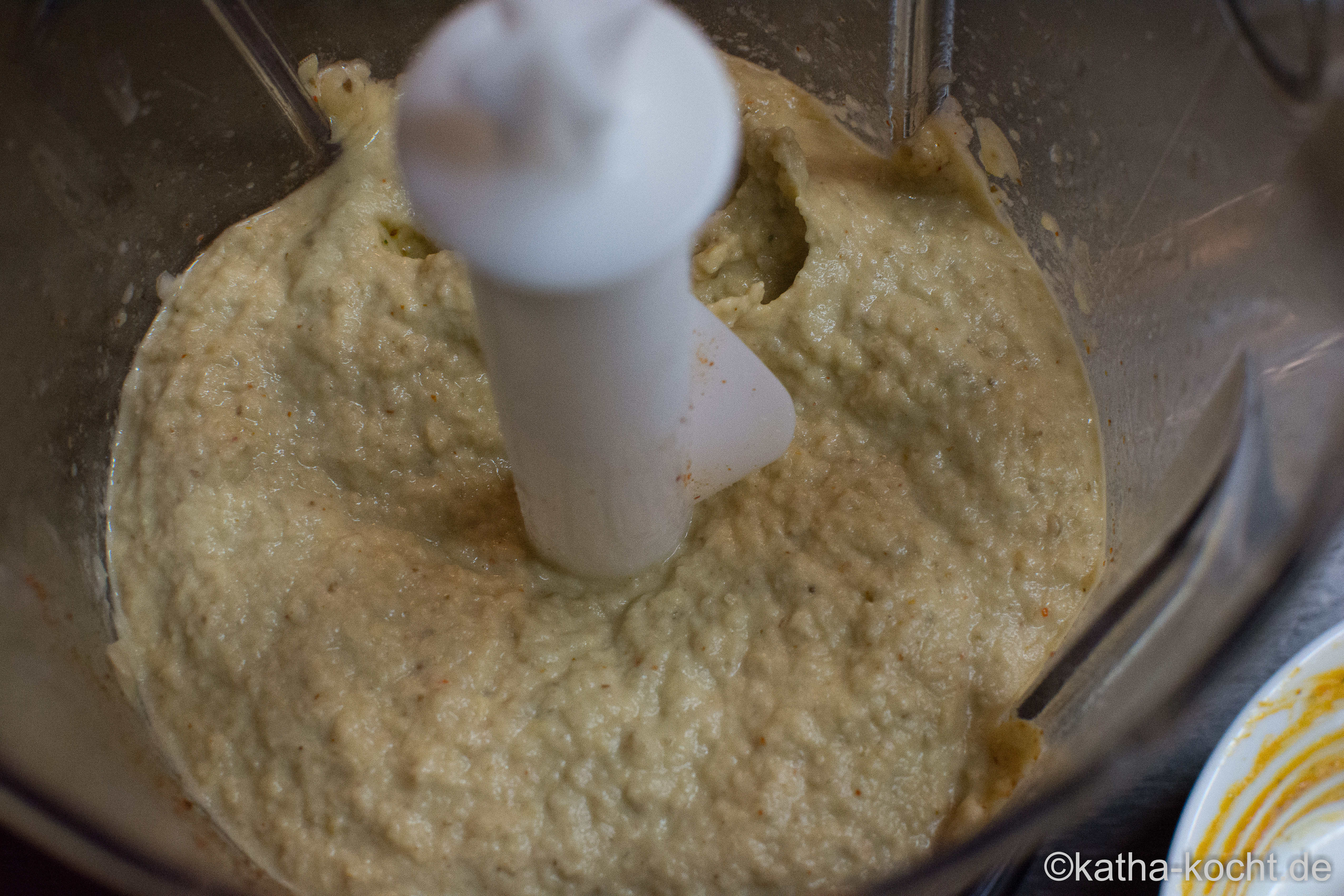 In dieser Zeit die Aubergine halbieren und die Schale von der Aubergine abziehen. Die Aubergine, die Kichererbsen (ohne die Flüssigkeit aus der Dose), die Sesampaste, das Sesamöl, etwas Salz, das Chilipulver, Cumin und den Limettensaft in den Mixer geben und zu einer glatten Paste pürieren. Abschmecken und bei Bedarf nochmal etwas Salz, Limettensaft oder Sesamöl zufügen.