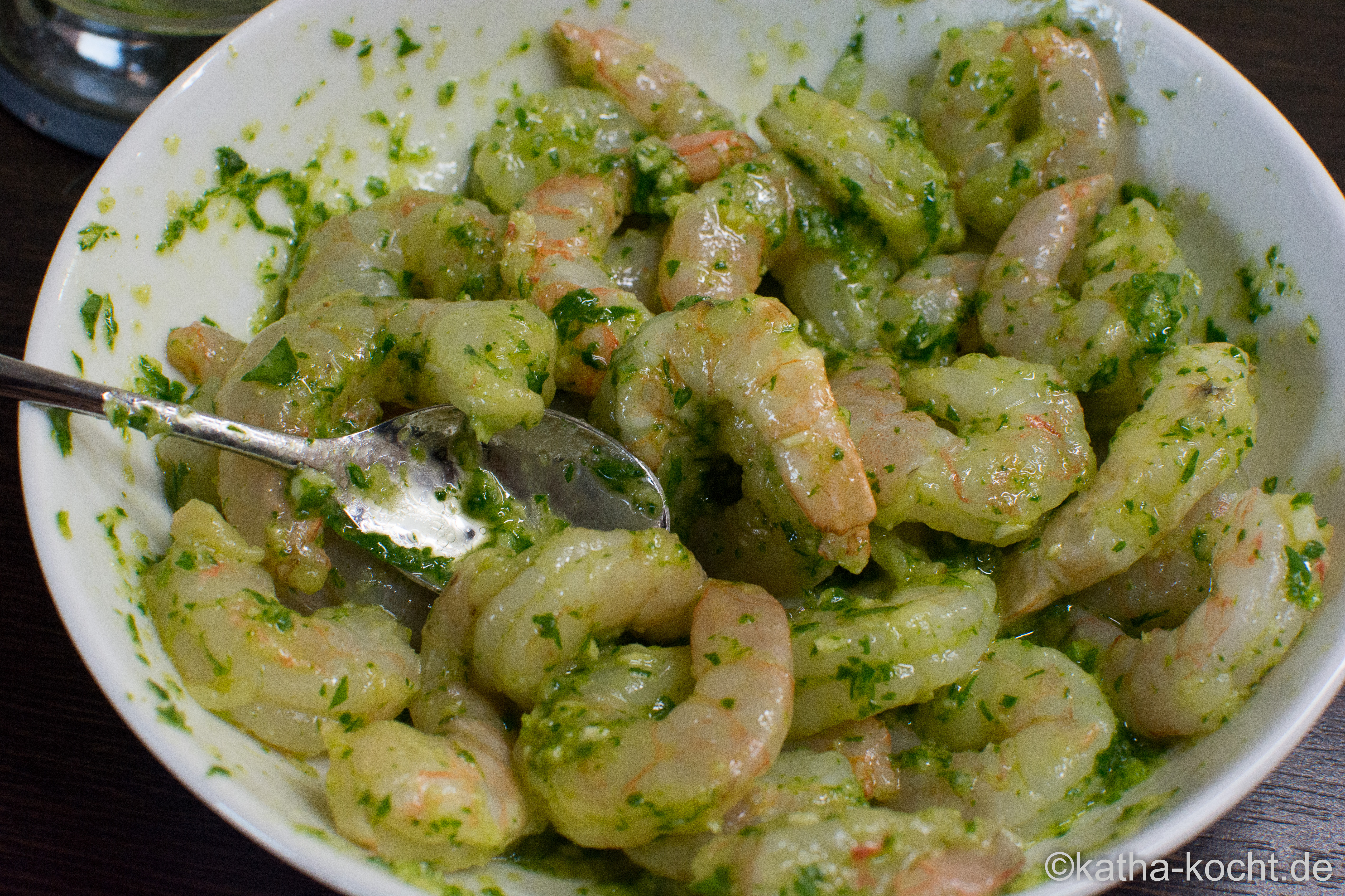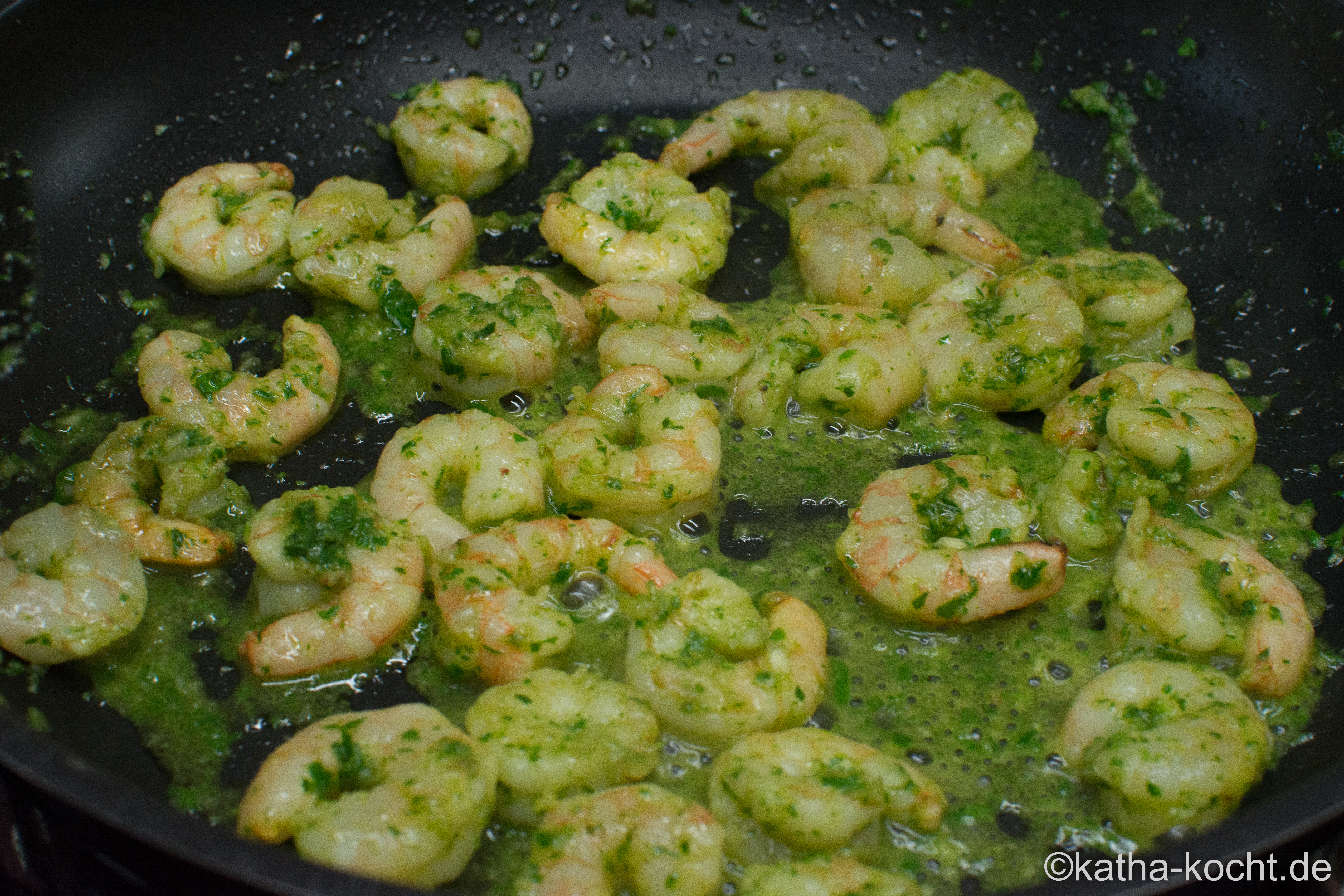 Eine beschichtete Pfanne erhitzen und die Garnelen samt Öl in die heiße Pfanne geben. 1 Minute scharf anbraten und danach bei reduzierter Hitze noch 3-4 Minuten gar ziehen lassen.