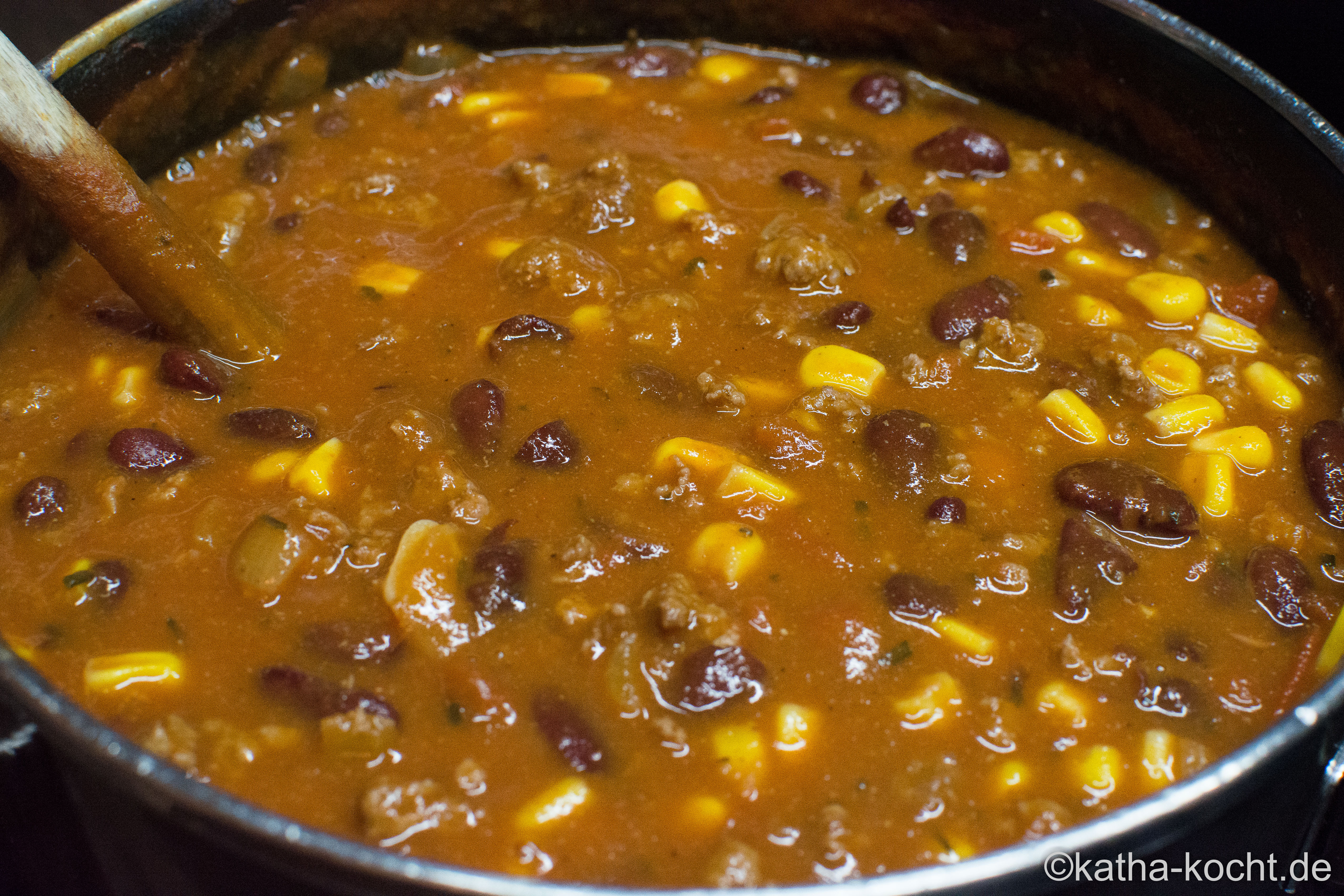 Die passierten Tomaten dazugeben und Alles einmal ordentlich durchrühren. DIe Tomaten aus der Dose grob zerteilen und ebenfalls in den Topf geben. Den Zucker und das Tomatenmark einrühren und alles unter regelmäßigem Rühren bei mittlerer Hitze 15 Minuten köcheln lassen. Dann den Mais zugeben und schonmal abschmecken. Je nach Geschmack noch mit Salz, Pfeffer, Paprikapulver, Tomatenmark, Cumin oder Chilipulver abschmecken.