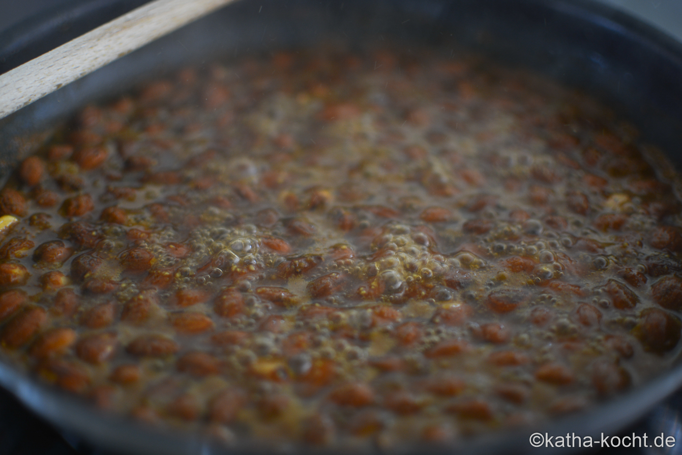 Auf hoher Stufe kochen lassen bis das Wasser vollständig verdunstet ist. Gut aufpassen, dass euch die Mandeln jetzt nicht noch anbrennen. Die Mandeln vom Herd nehmen und komplett trocknen lassen. Am besten über Nacht.
