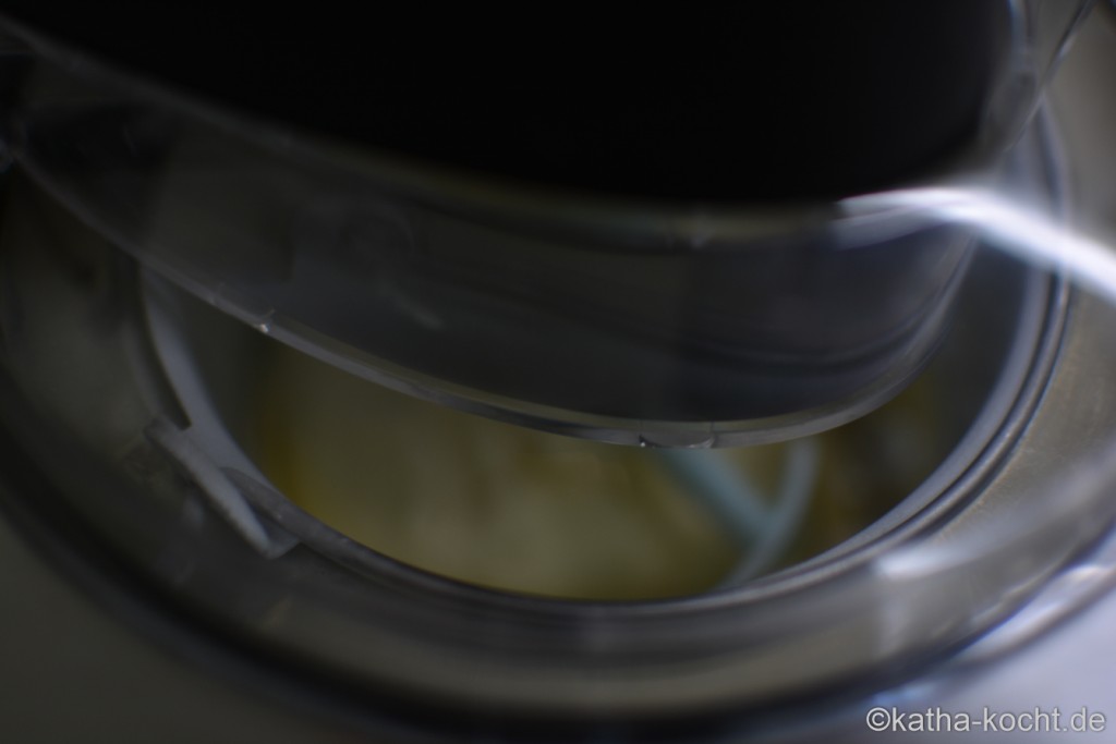 Die Eismasse in die Eismaschine geben. Hier darf sie ungefähr 50 Minuten lang ihre Runden drehen.
