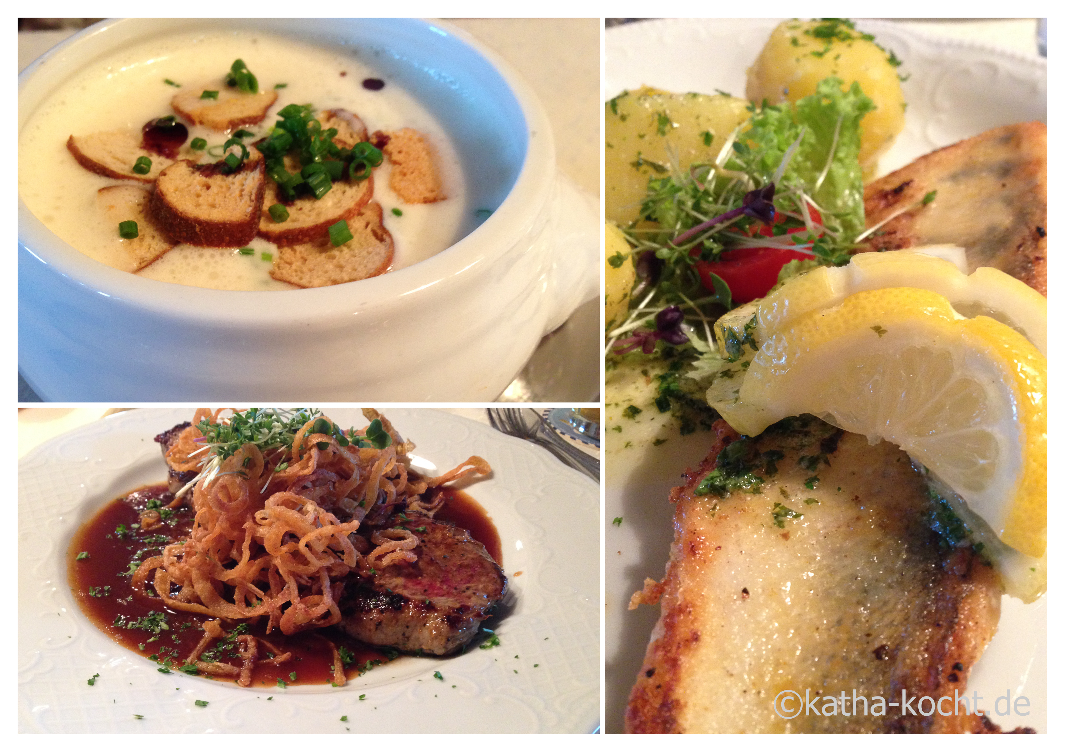 Zum Abendessen gibt es dann eine Käsesuppe, die wir uns diesmal teilen – wir haben ja gelernt… gefolgt von einem Stück Zander für mich und dem Zwiebelrostbraten für Bessere Hälfte.