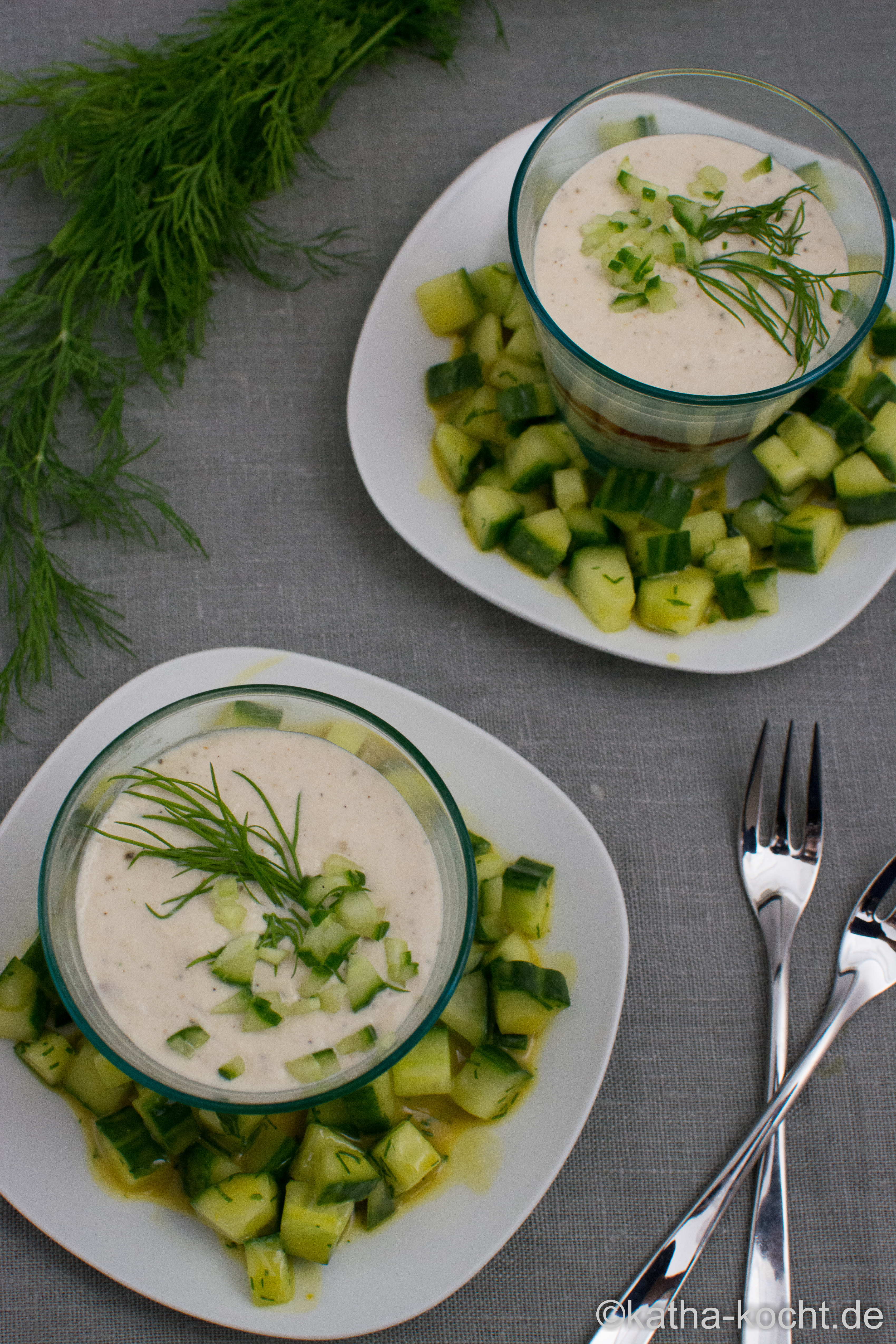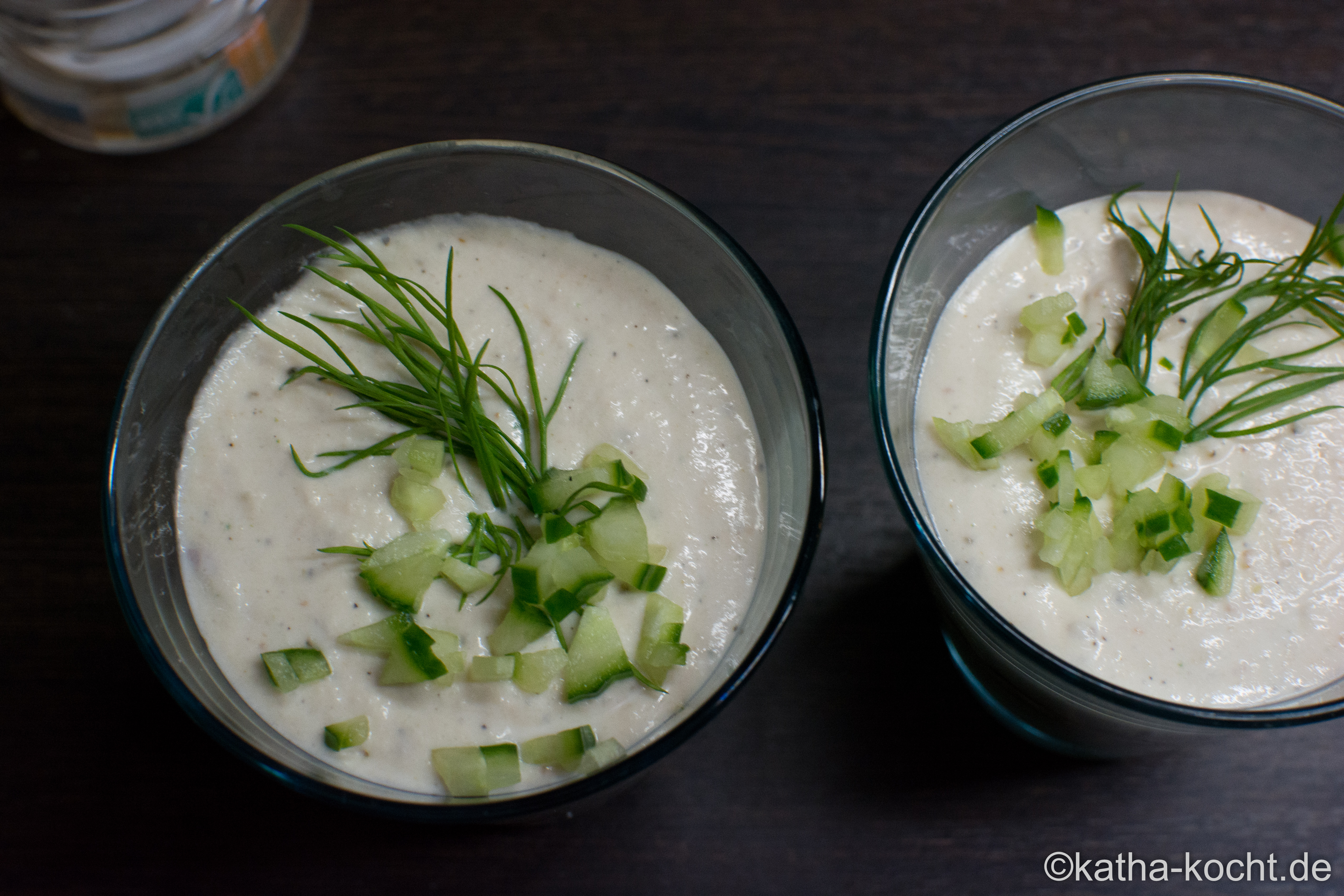 Die Gurke längst vierteln, von den Kernen befreien und ein kleines Stück sehr fein würfeln. Etwas Dill und die Gurkenwürfel als Topping auf das Glas geben. Die Creme 15 Minuten kalt stellen.