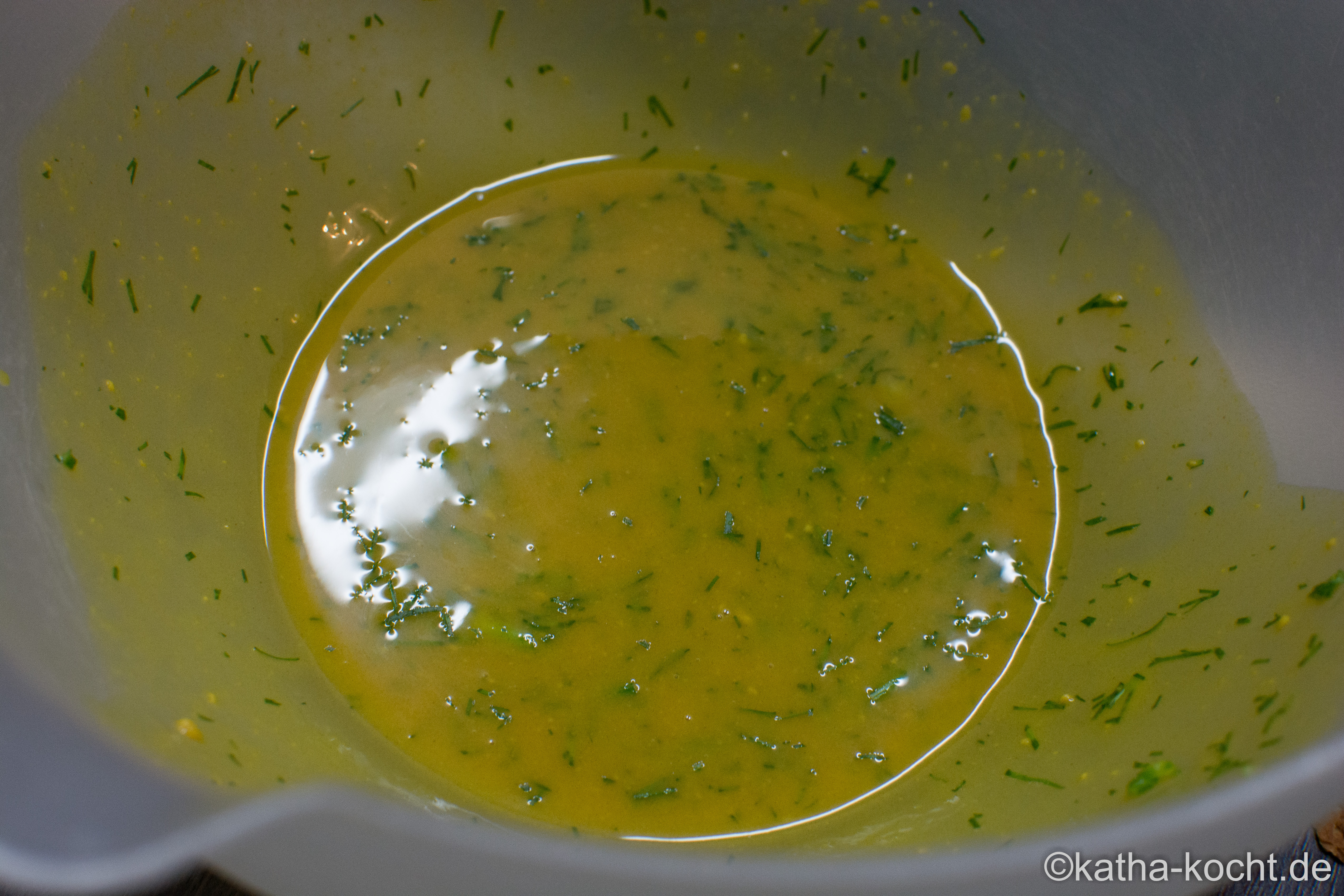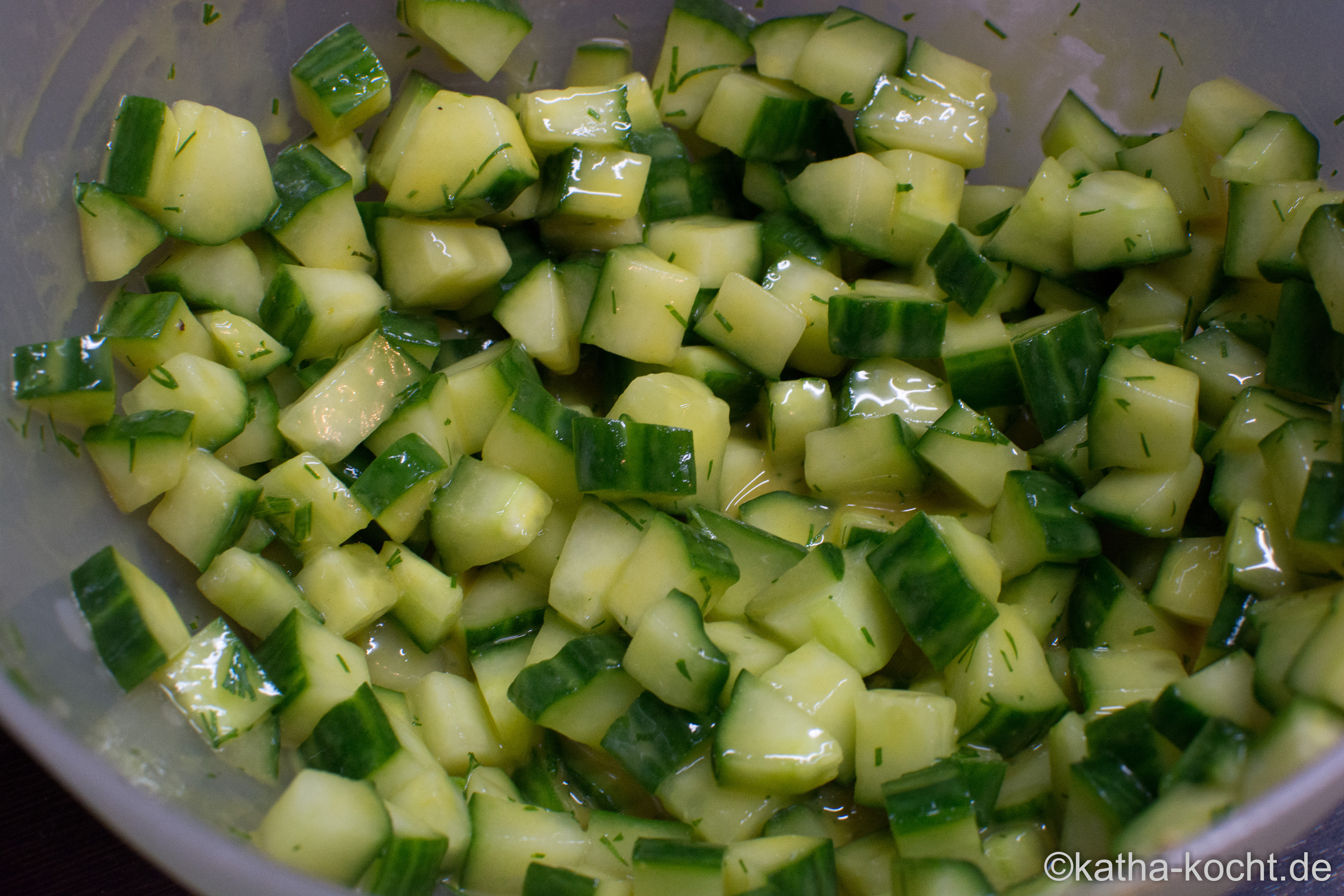 Die restliche Gurke würfeln und salzen. In einem Sieb abtropfen lassen. In dieser Zeit den Gin mit Honig, Senf und frisch gehacktem Dill zu einem Dressing verrühren.