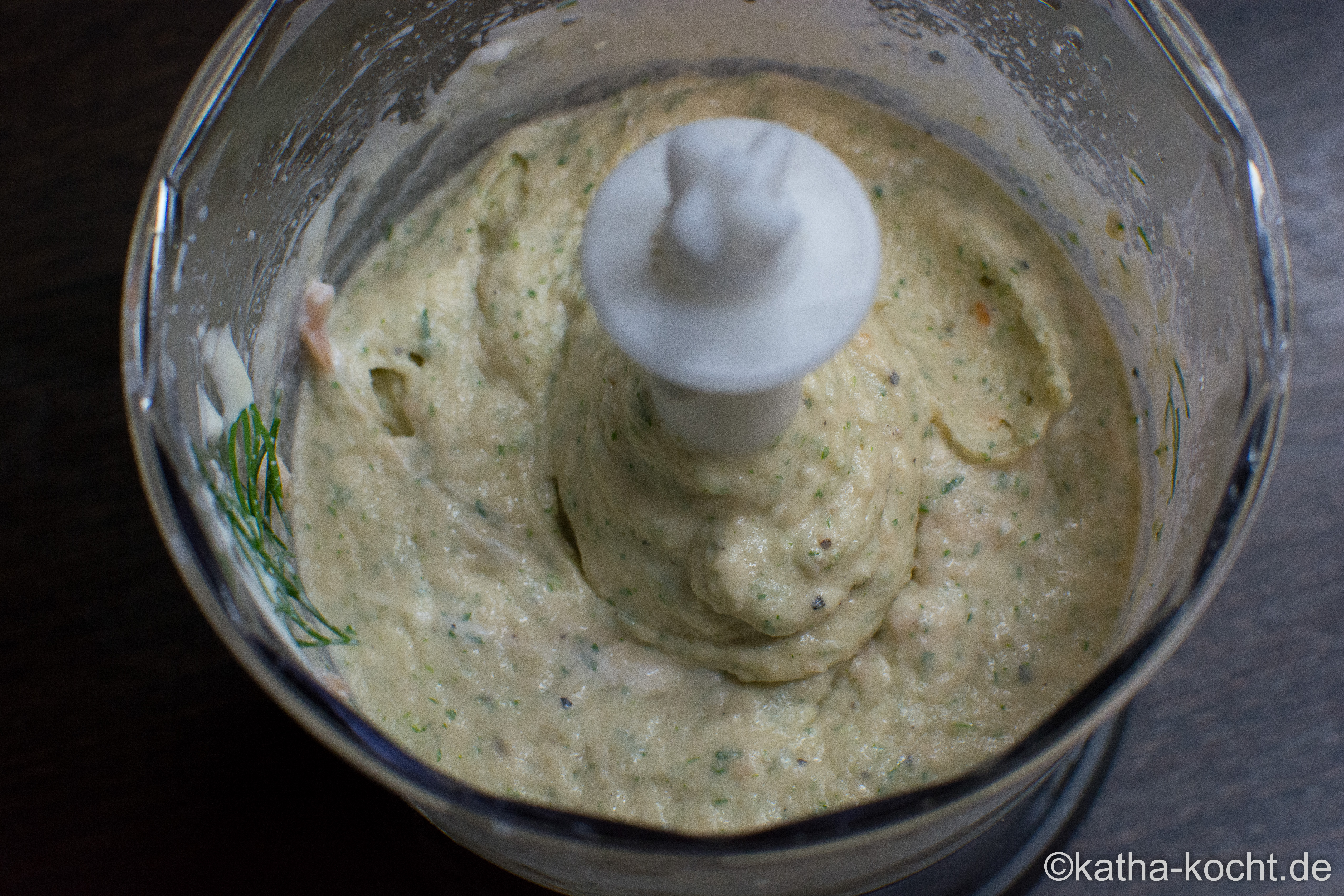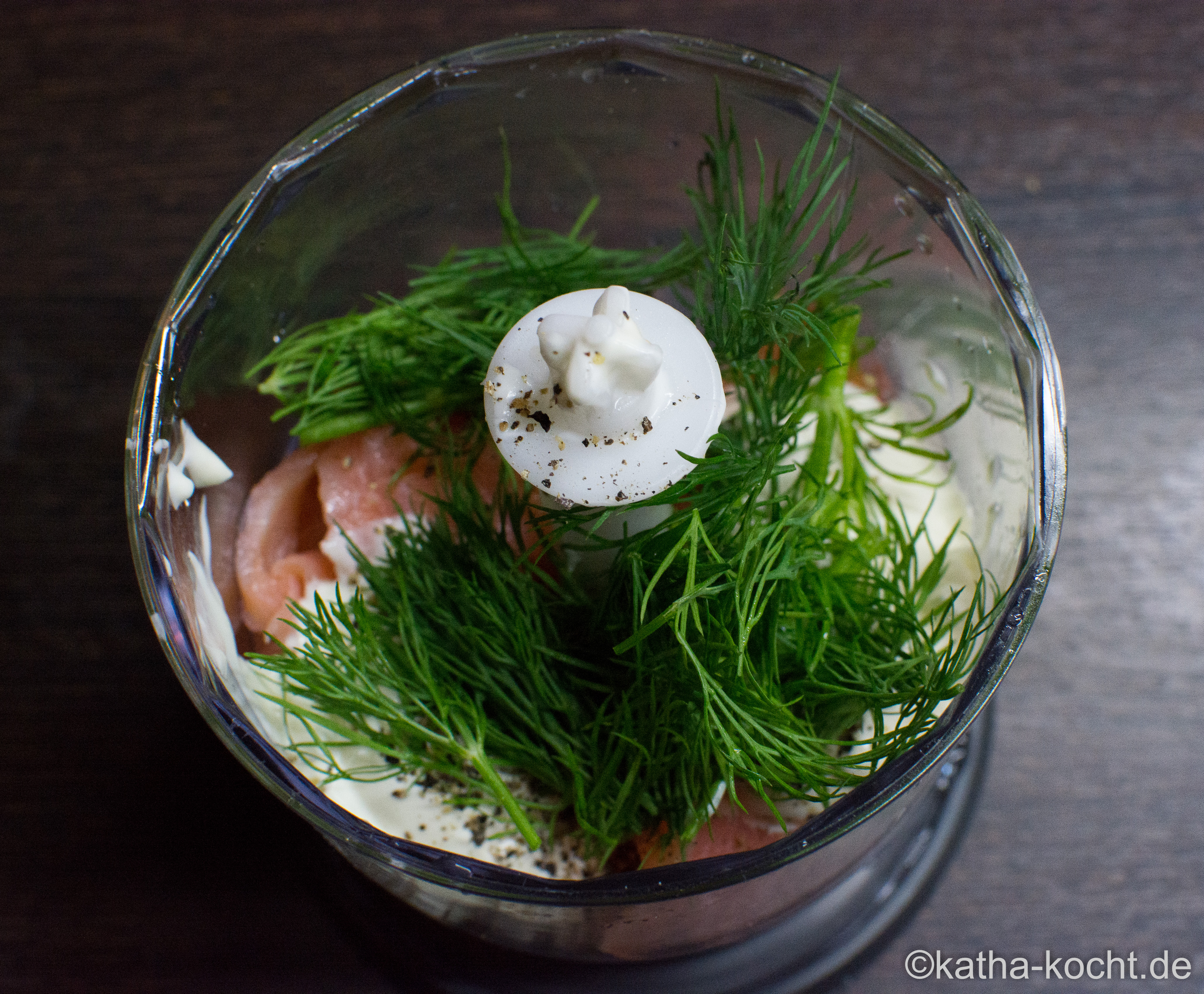 Den Lachs, 50g Creme fraîche, eine gute Prise Pfeffer und etwas grob gehackten Dill in einen kleinen Mixer geben und zu einer glatten Creme pürieren.