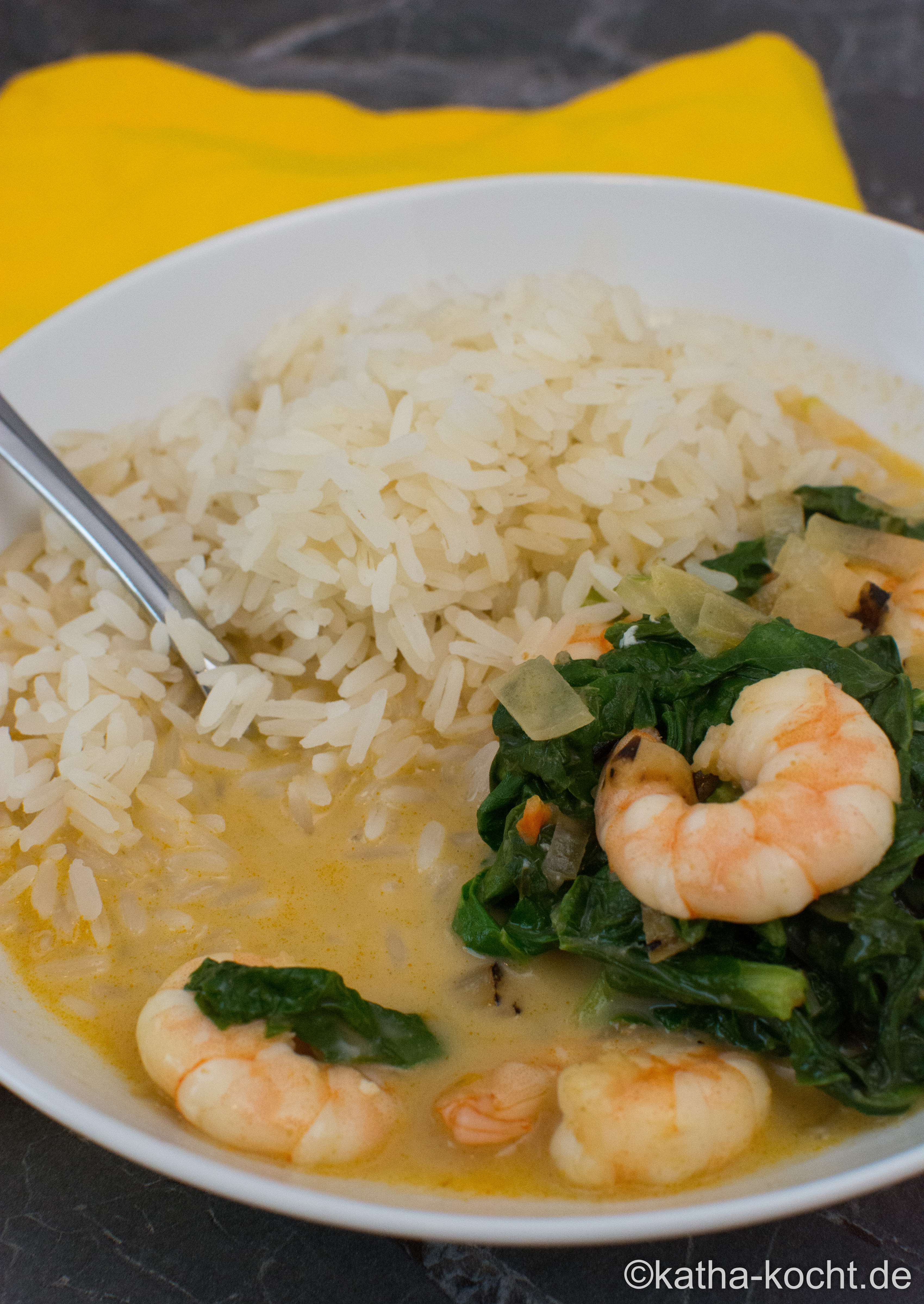 Den Reis abgießen und auf zwei Teller verteilen. Das Garnelen Curry dazu geben und und sofort heiß auf den Tisch stellen.