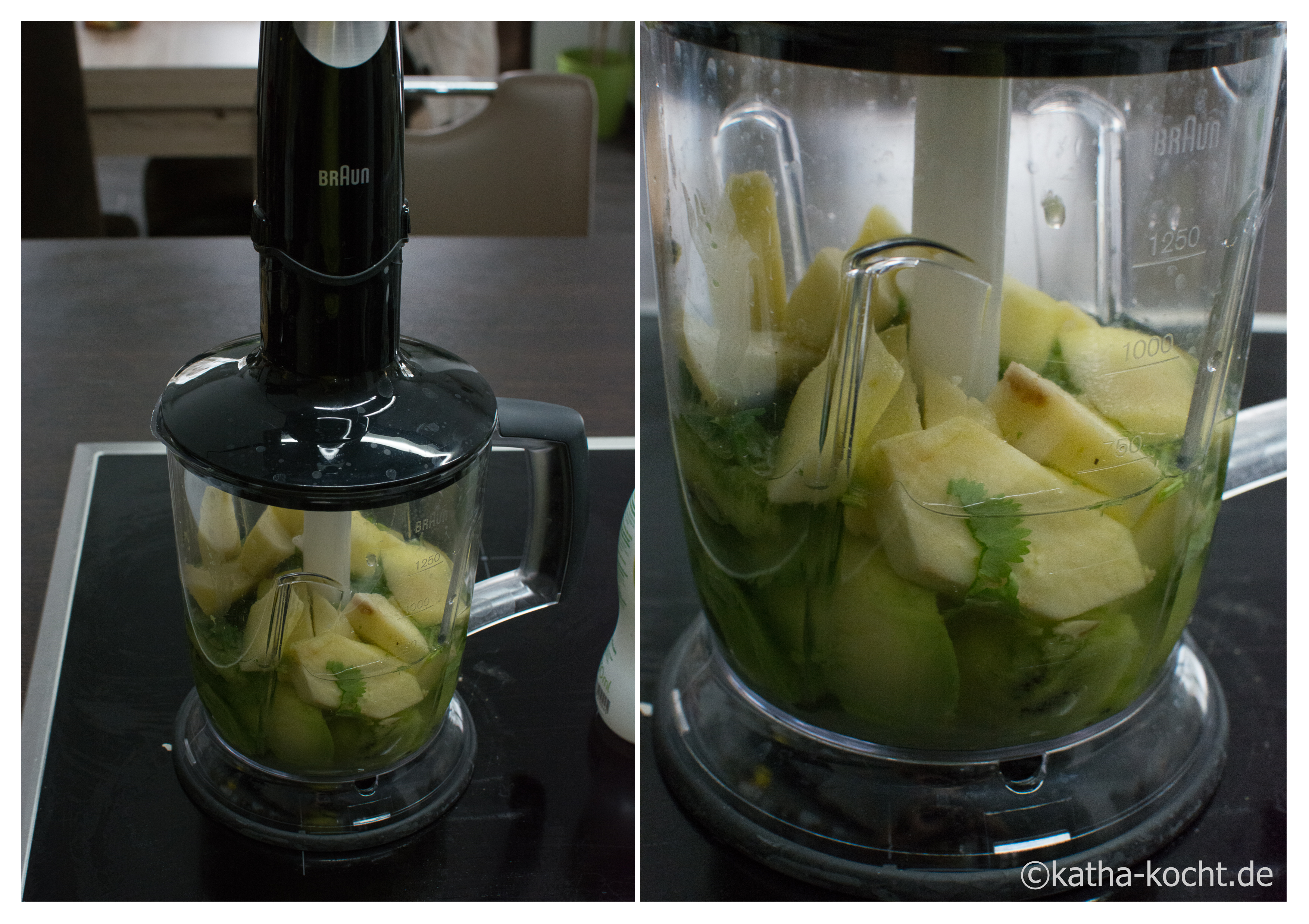 Die Avocado halbieren, den Stein entfernen und das Fruchtfleisch aus der Schale löffeln. Den Apfel schälen, vierteln und das Kerngehäuse entfernen. Die Kiwis halbieren und aus der Schale löffeln und den Koriander grob hacken. Alles zusammen mit dem Kokosnusswasser in den Mixer geben und mixen bis keine Stücken mehr zu sehen sind.