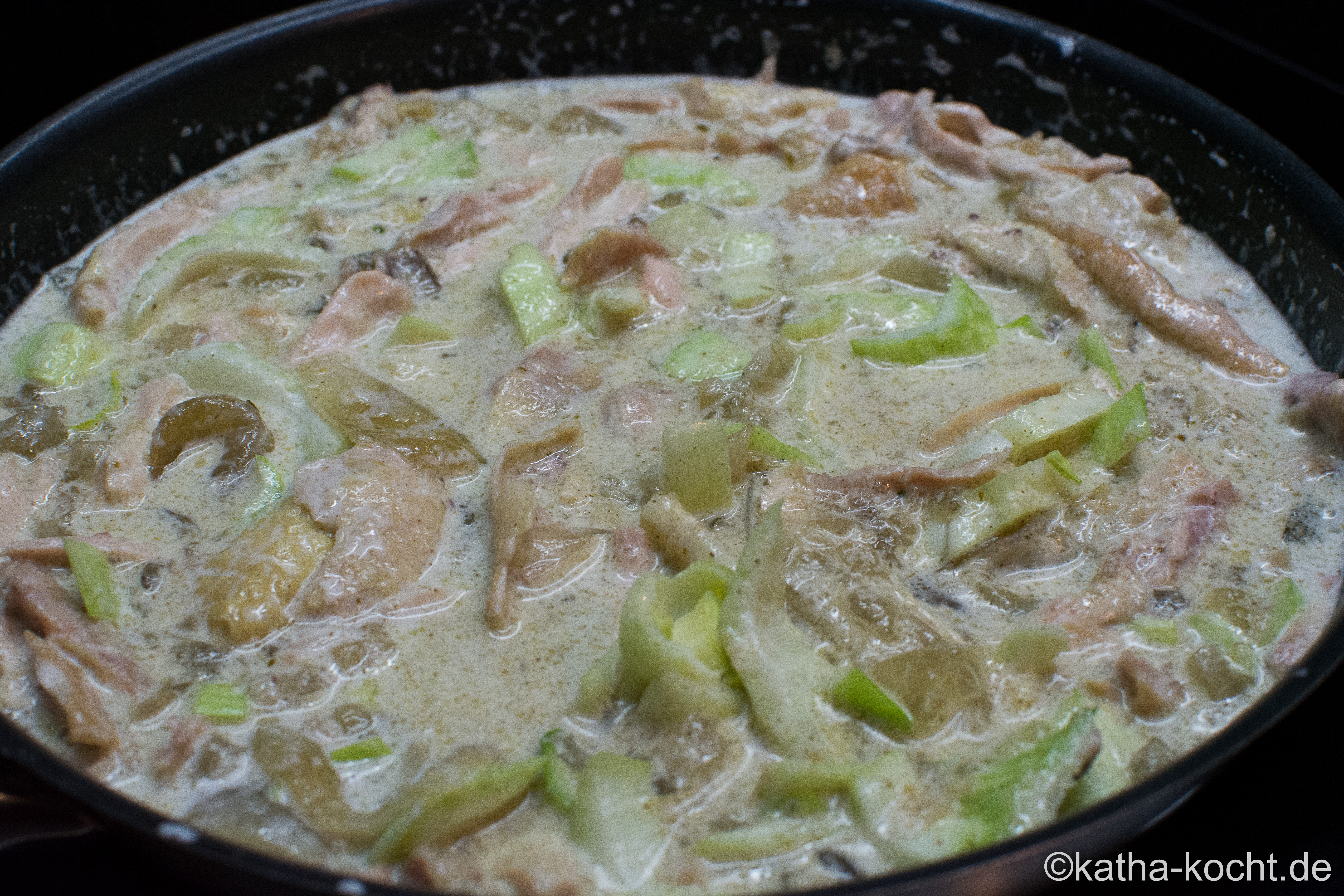 Die Hähnchenkeulen habe ich bereits zwei Tage vorher (einige Stunden vorher reicht aber aus) in einen ofenfesten Topf mit etwas Salzwasser gegeben. Die Zwiebel grob würfeln und dazu geben und den Topf bei 160°C für 2 Stunden in den Backofen schieben. Vollständig abkühlen lassen und das Fleisch von den Knochen lösen.
