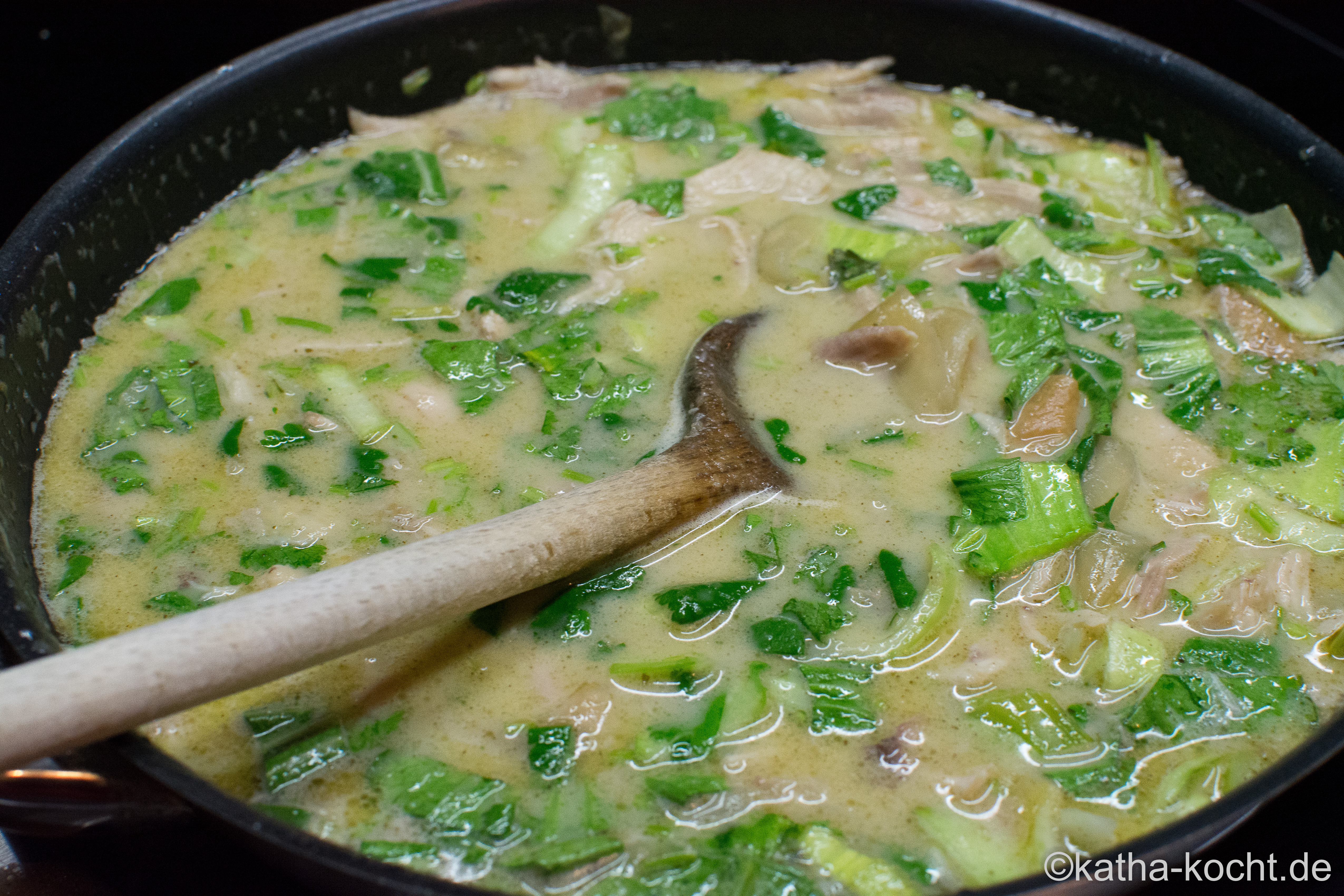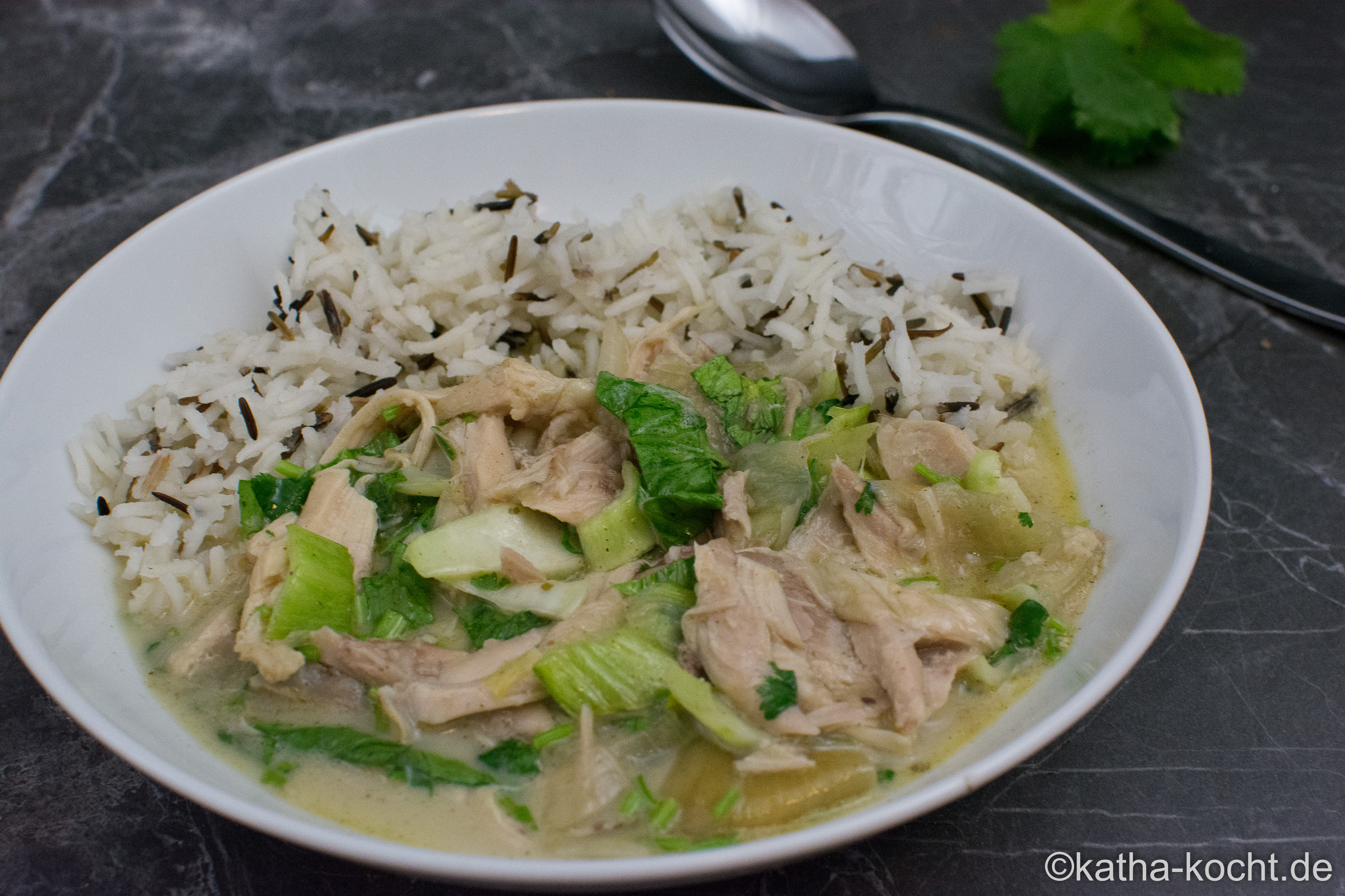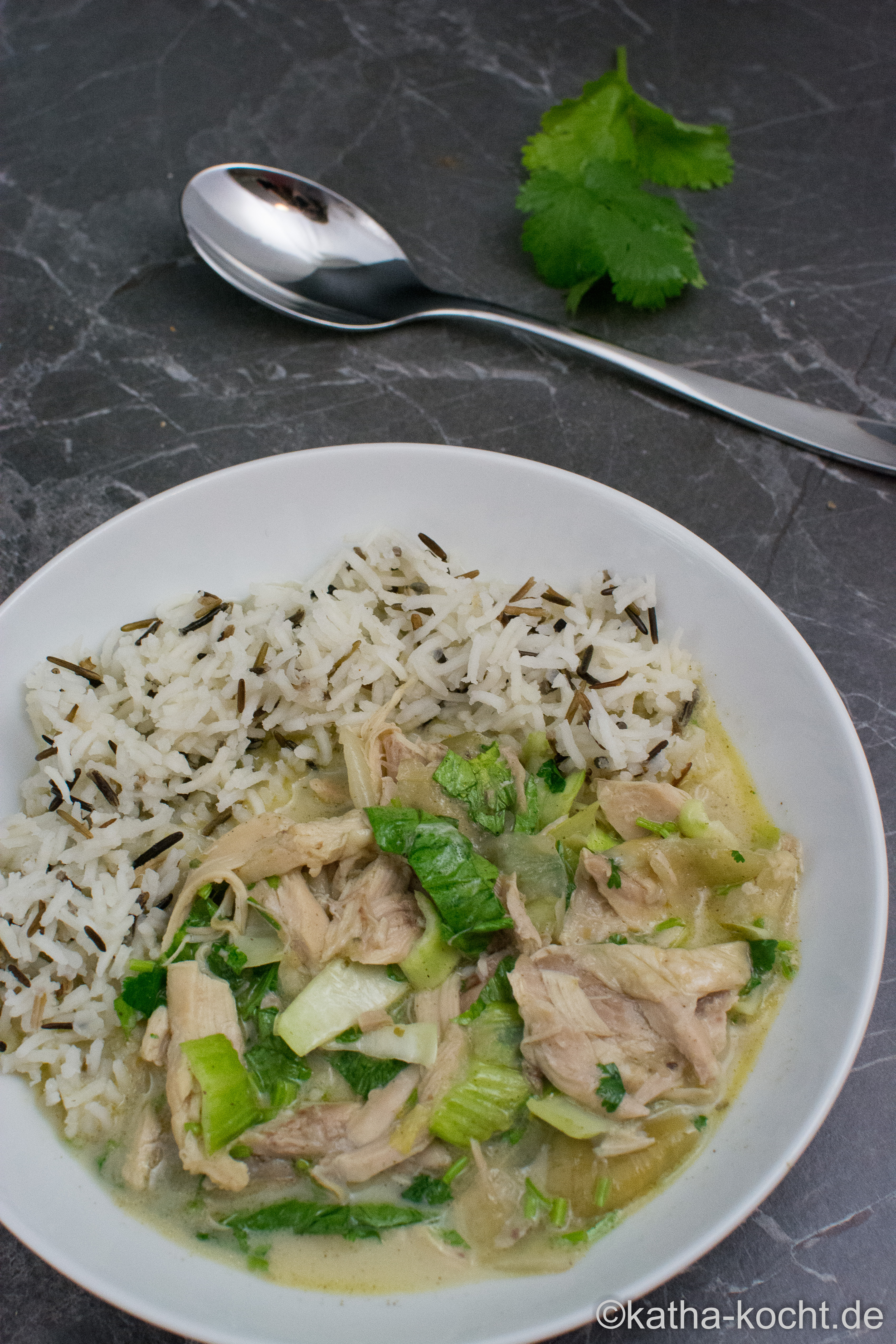Als ich die Hähnchenkeulen für die Lasagne vorbereitet habe war ich nicht ganz sicher wie viele ich brauchen würde. Also habe ich vier Stück geschmort – so hat sich die Garzeit im Ofen wenigstens gelohnt und geschaut was übrig bleibt. Von vier Maishähnchenkeulen habe ich 2 ½ gebraucht, der Rest ist samt Brühe erst einmal in den Kühlschrank gewandert. Nach kurzem hin und her überlegen habe ich mich dann am nächsten Tag für ein grünes Hähnchencurry entschieden. Der letzte Pak Choi ist mit ins Curry gewandert und auch die halbe Dose Kokosmilch vom Kichererbsencurry kam zum Einsatz. Das Ergebnis war ein super einfaches, scharfes und leckeres grünes Curry – serviert mit Reis und bis auf den letzten Klecks Sauce verputzt!