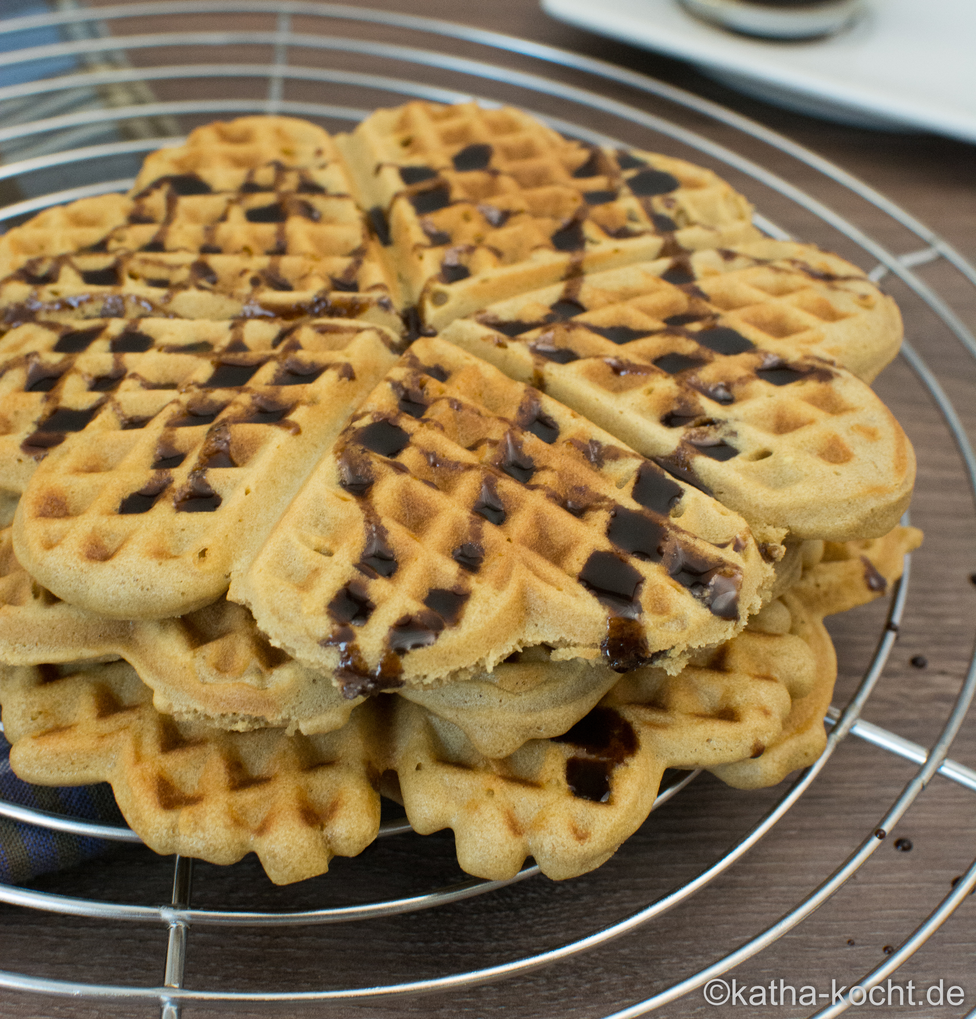 Das Waffeleisen vorheizen und mit etwas Öl einpinseln. Jeweils 2 EL Teig auf das Waffeleisen geben und so lange backen, bis die gewünschte Bräunung erreicht ist.