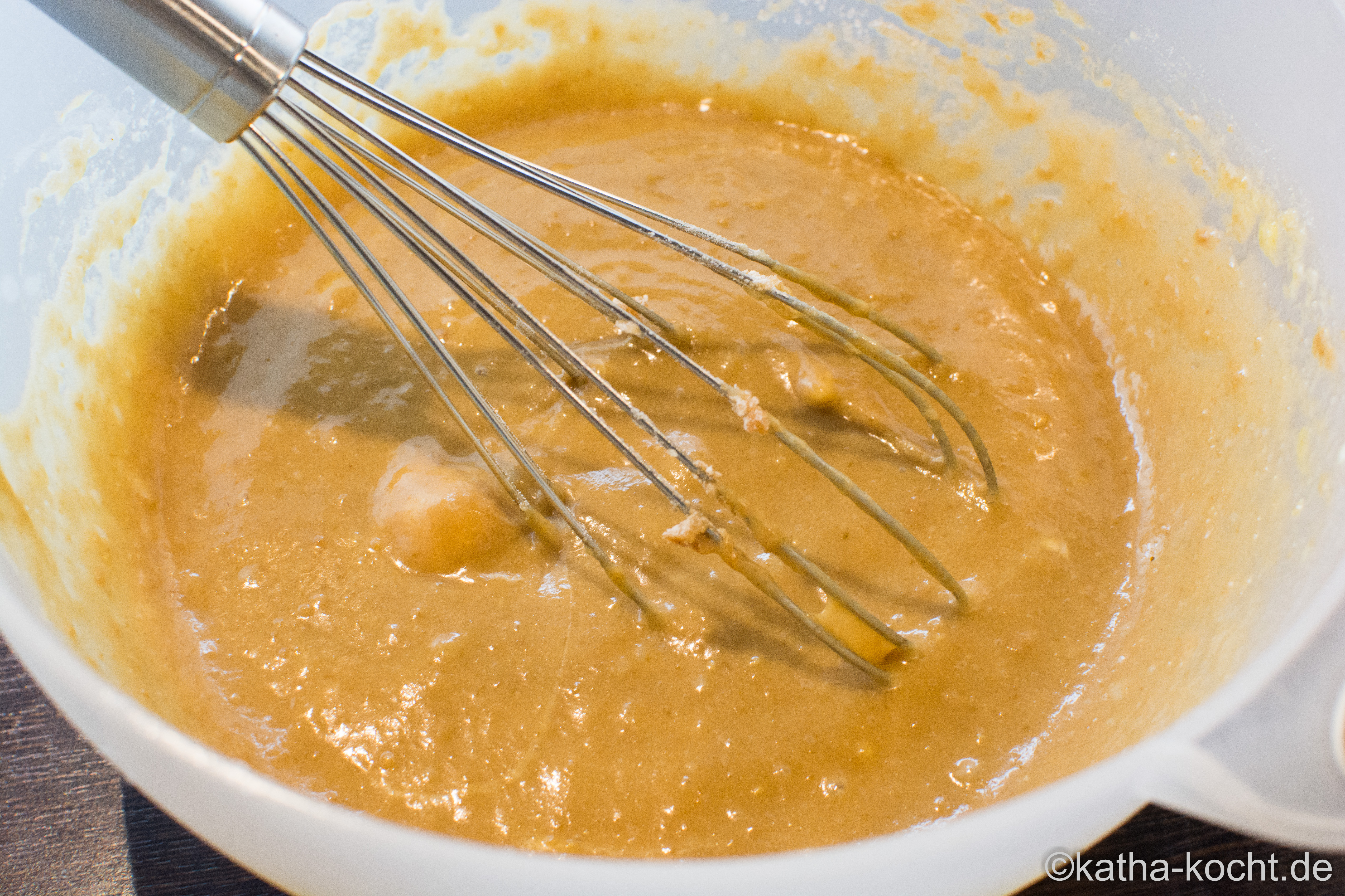 Den Espresso frisch zubereiten und mit dem Zucker verrühren. Nacheinander Butter, Eier, Backpulver, Mehl und Salz zufügen und mit dem Schneebesen verrühren bis ihr einen glatten Teig habt.