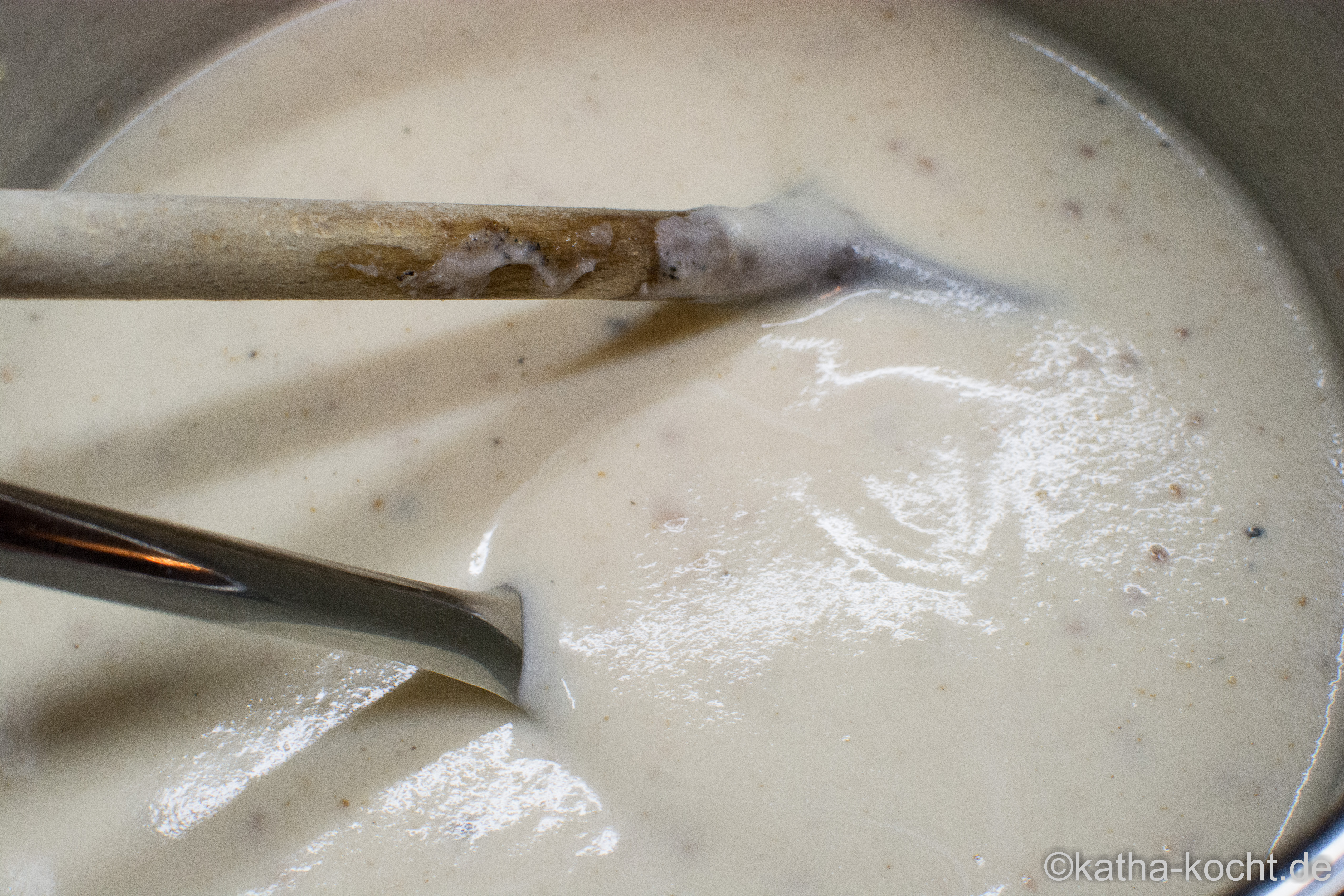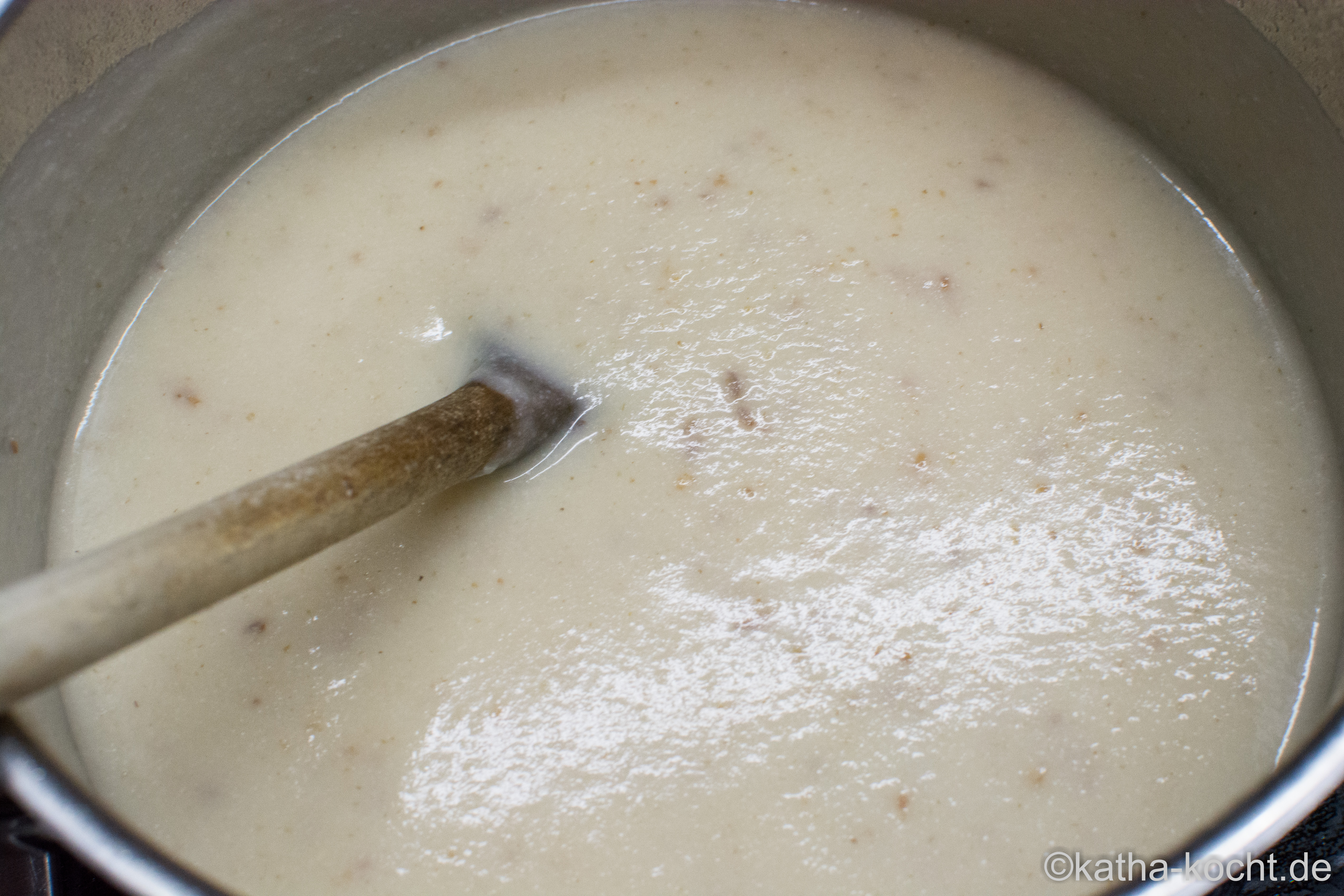 Das Ganze mit dem Wasser ablöschen und eine gute Prise Salz zufügen. 20 Minuten sanft köcheln lassen. Dann die Suppe mit dem Stabmixer fein pürieren…
