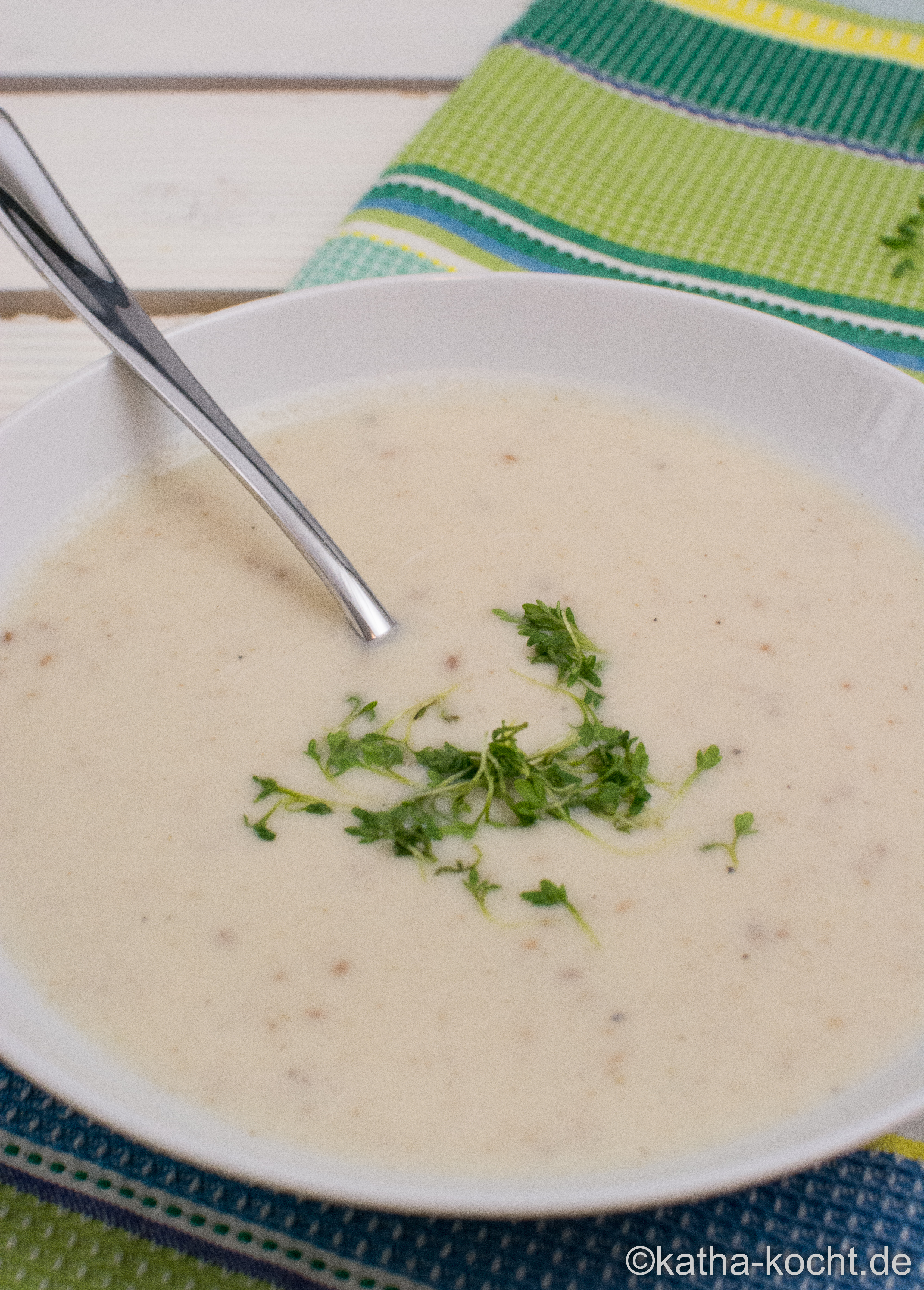 Mit Salz, Pfeffer, etwas Zucker und Zitronensaft abschmecken. Die Suppe auf tiefe Teller verteilen und mit etwas Kresse garnieren. Ich stelle als Einlage noch ein Schälchen mit klein gezupftem Räucherlachs auf den Tisch – der passt ziemlich gut dazu. Wer möchte serviert die Suppe außerdem mit etwas Brot, ich finde sie aber auch so wunderbar sättigend…