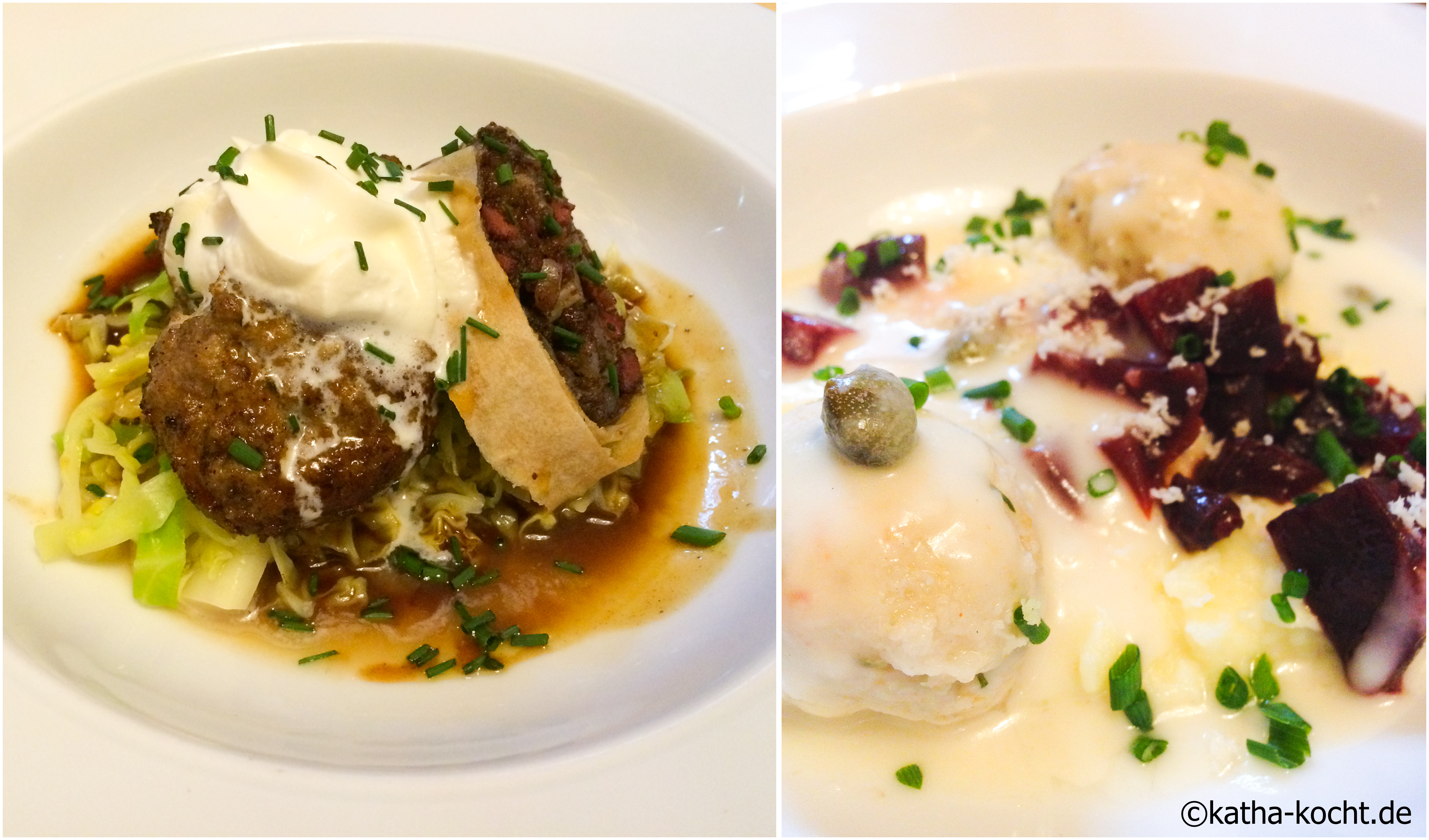Parallel dazu gibt es von Thomas Kurt super zarte Königsberger Klopse vom Hecht mit roter Bete, KArtoffelpüree und Meerrttich. Die waren einfach unglaublich gut, total zart und fein abgeschmeckt – und damit ein ebenso toller Start in den Abend wie die Rehbouletten.