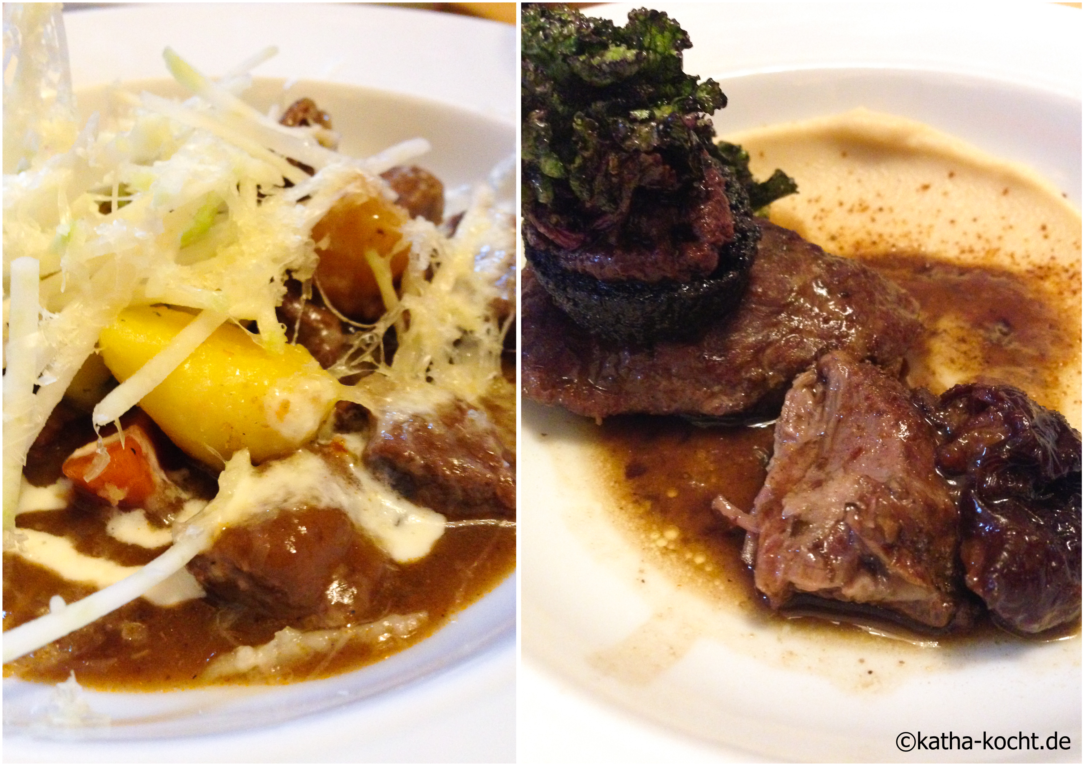 Dazu hatten wir das Sugo vom Dammhirschkalb mit Kartoffel-Orangennocken und geriebenem Bergkäse von Markus Herbicht. Das versteckt sich auf dem Foto alles ein bisschen unter dem Käse. Die Nocken waren extrem lecker, das Hirschkalb ein ganz klein bissl trocken, aber wirklich nur einen Tick.