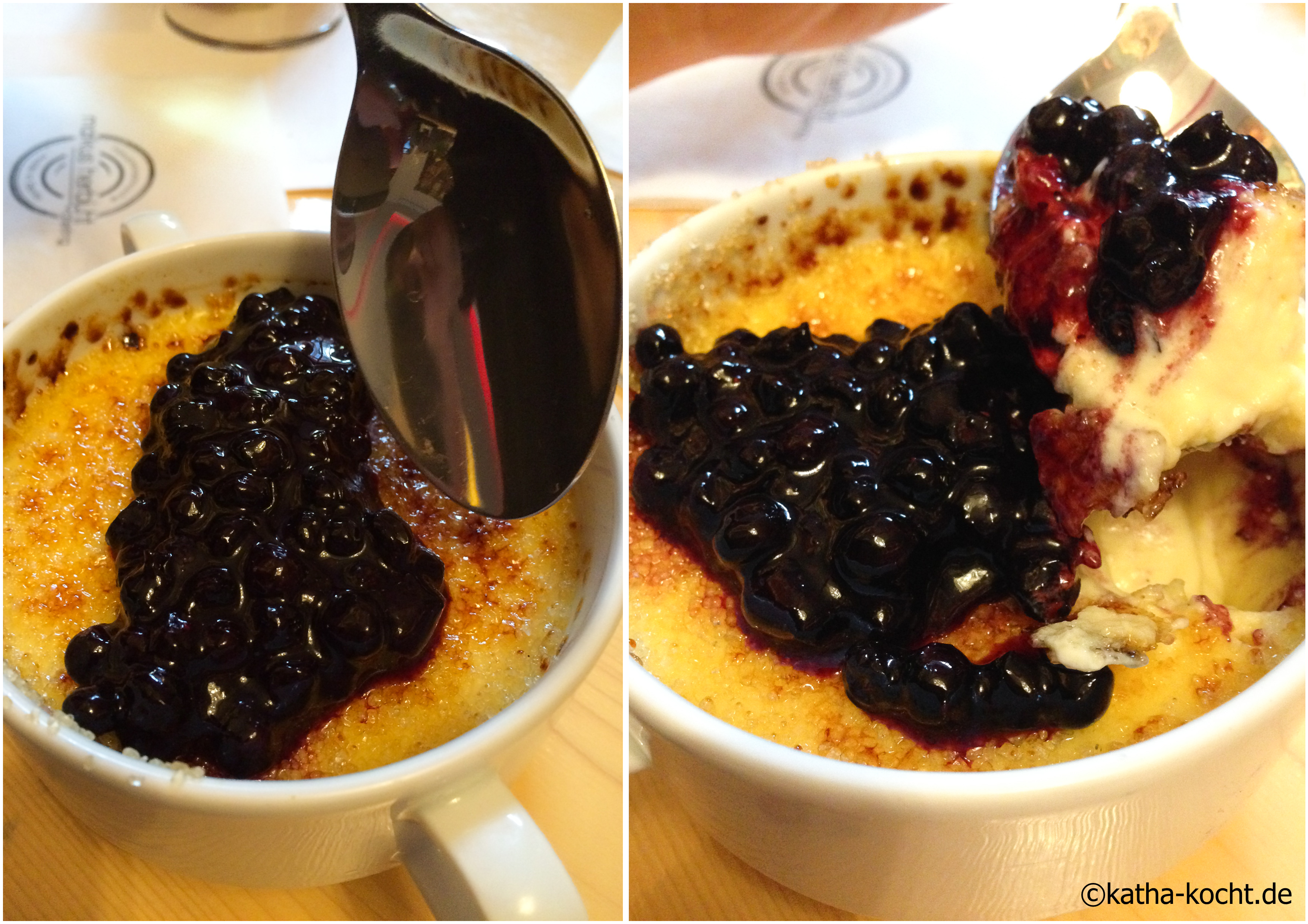 Zum krönenden Abschluss gibt es die katalanische Crème mit Blaubeeren in Cassissauce von Herbert Beltle. Die hatten wir schon im letzten Jahr und bei unserem Besuch im Altes Zollhaus und ganz ehrlich – wir werden sie auch nächstes Jahr wieder haben falls es die Möglichkeit gibt, die ist nämlich einfach nur zum reinlegen!