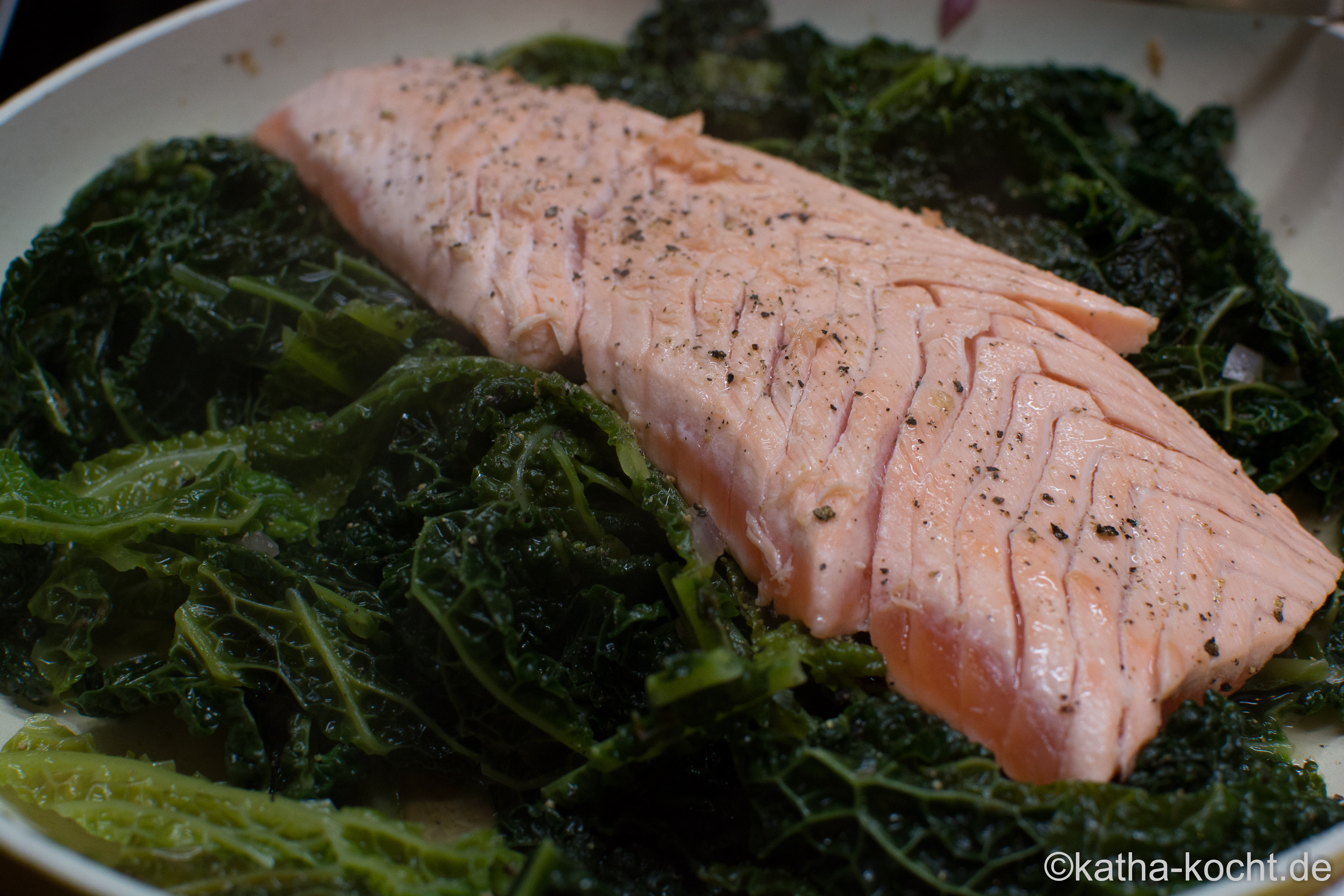 Eine halbe Tasse Wasser in die Pfanne geben und den Lachs auf dem Wirsing platzieren. Ungefähr 5 Minuten bei mittlerer Hitze garen.