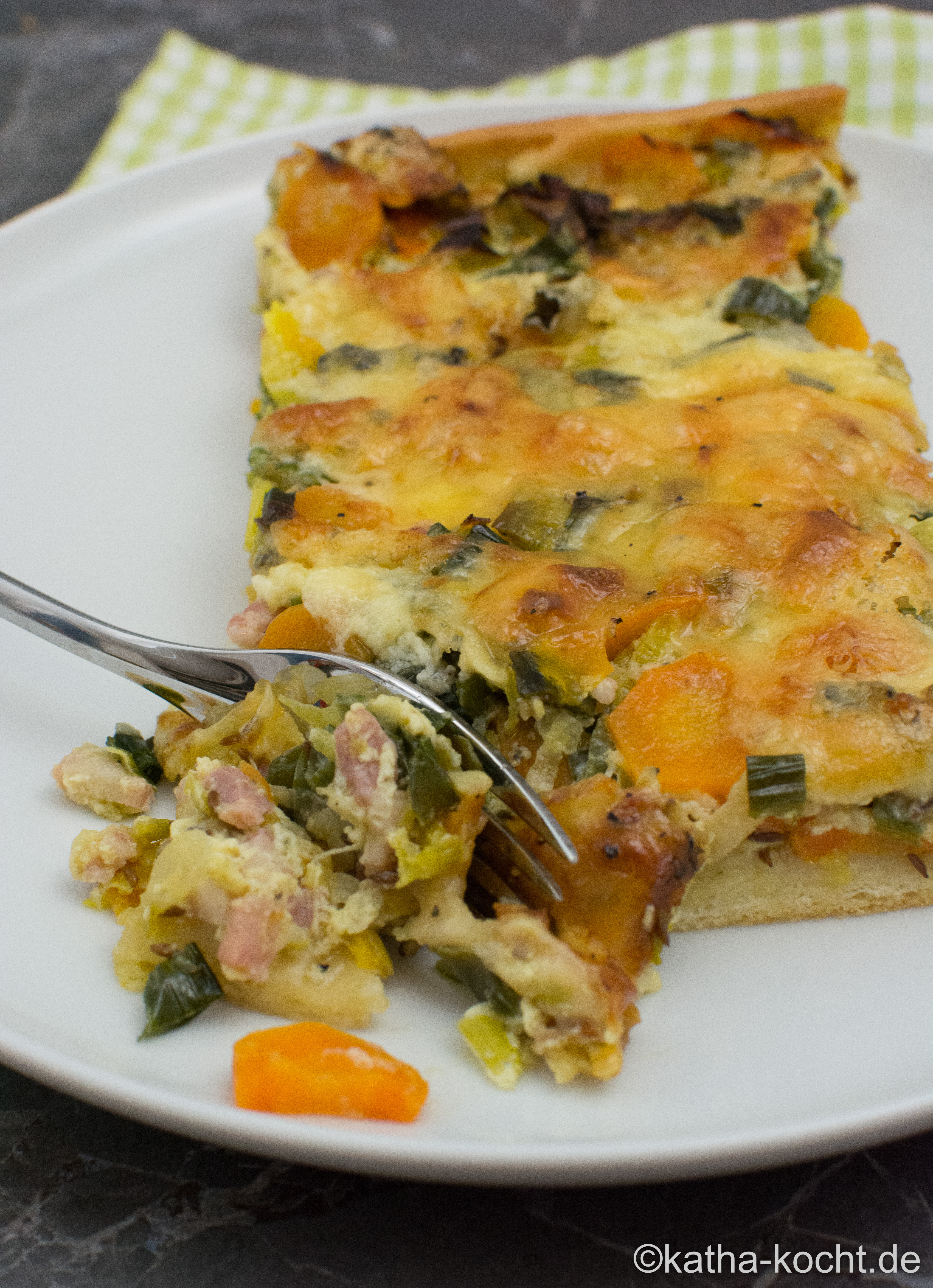 Ein Vorteil an dem aktuellen Wetter ist, dass es noch nicht zu spät ist diesen deftigen und super leckeren Lauch-Karotten Kuchen mit euch zu teilen! Es war das zweite Rezept aus Frank Oehler’s Kochbuch Der Speisemeister* und ist reinstes Soulfood. Was mir dabei besonders gut gefallen hat ist, dass ein Hefeteig verwendet wird und kein Mürbeteig. Mit Mürbeteig tue ich mich immer ein bisschen schwer, Hefeteig ist aus meiner Sicht deutlich einfacher zu verarbeiten und gelingt mir immer. Das Basisrezept ist wie viele Rezepte im Buch vegetarisch, lustigerweise dacht ich mir: „da passt doch Speck dazu“ und was lese ich in der Fußnote – als besonders deftige Variante passt Speck. Sehr schön – dazu eine hausgemachte Hollandaise als kleines i-Tüpfelchen, die Reste haben wir aber einfach mit einem Klecks Créme fraîche verputzt. Und noch eine kleine Anmerkung – die Originalangabe ist für 4 Personen. Die müssen dann aber komplett ausgehungert sein. Ich denke als Essen für 6-8 Personen ist das Blech durchaus realistisch.