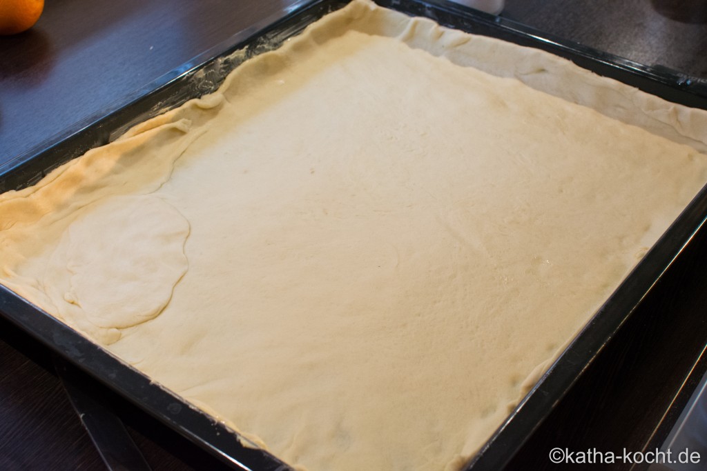Das Backblech mit Butter einfetten und die Arbeitsfläche mit Mehl bestäuben. Den Teig ausrollen und auf das Blech ziehen.