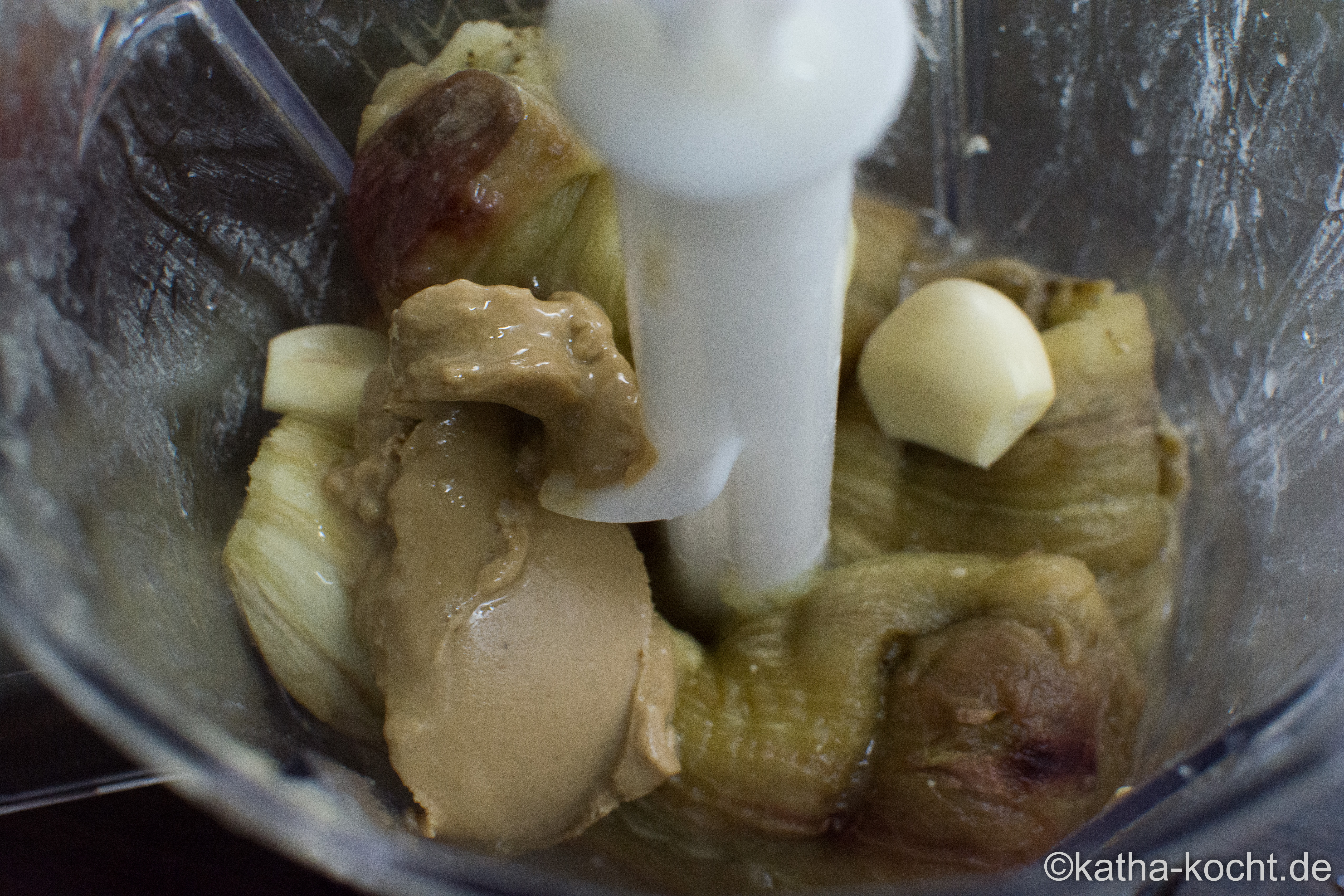 Die Auberginen mehrfach mit der Gabel einstechen und bei 180°C im Backofen weich backen. Die fertig gebackenen Auberginen halbieren und mit dem Löffel ausschaben. Den Inhalt der Aubergine mit Tahini, Knoblauch Pfeffer und Salz in den Mixer geben…