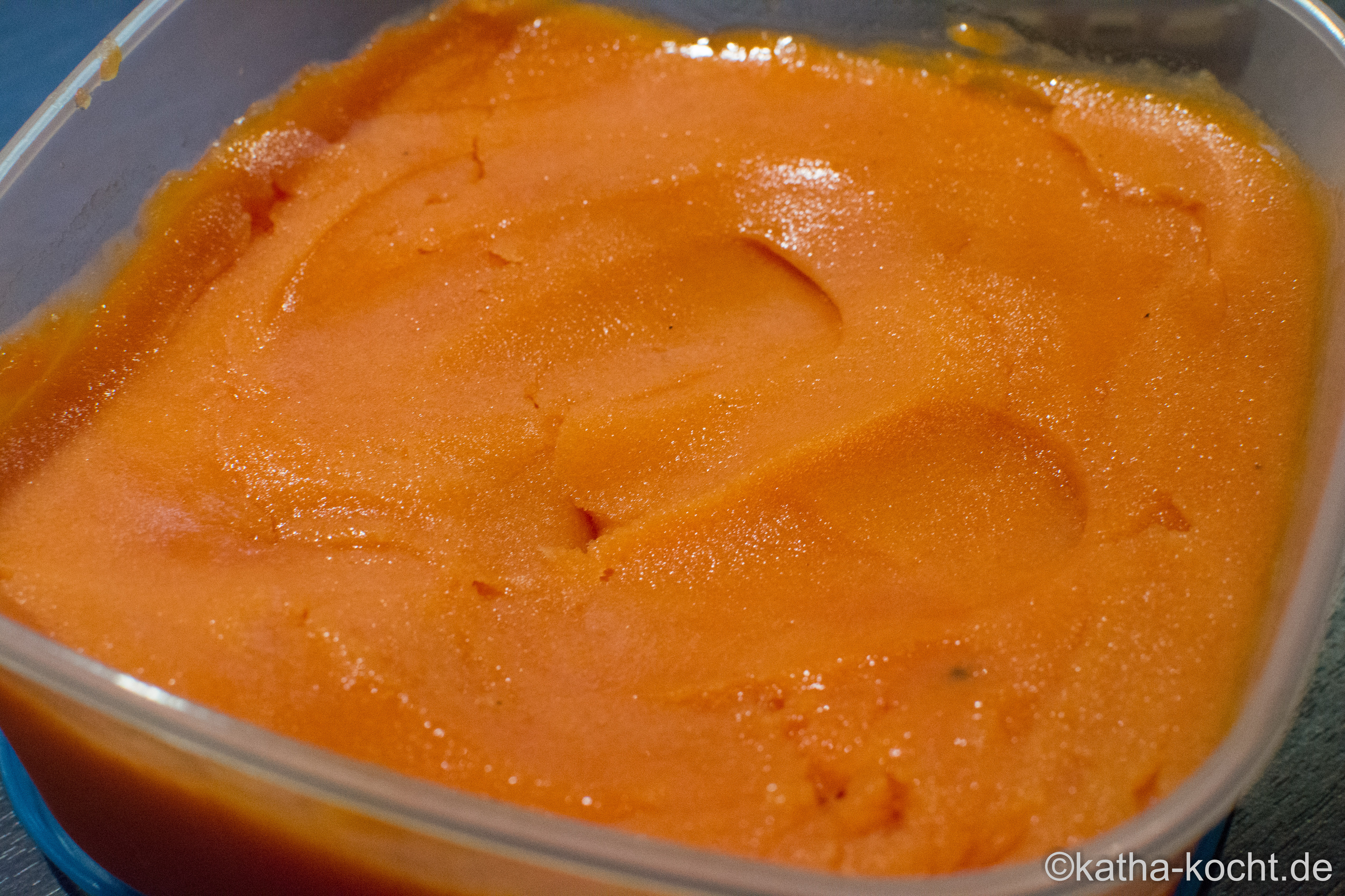 Das Papaya Sorbet in einen passenden Behälter füllen und 2-3 Stunden im Tiefkühler zu Ende frieren lassen.