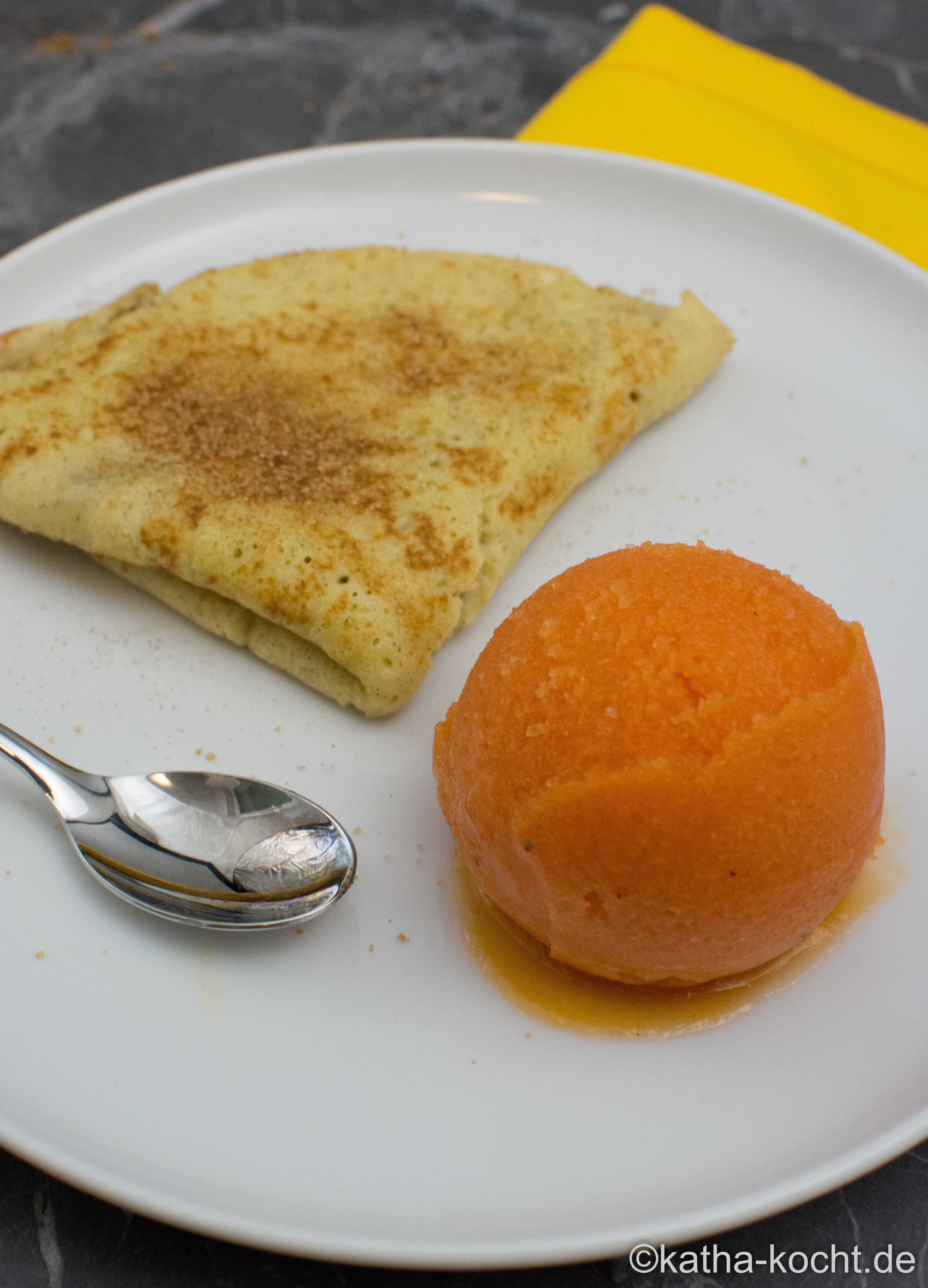 Jeweils einen Crêpe mit einer Kugel Papaya Sorbet servieren.