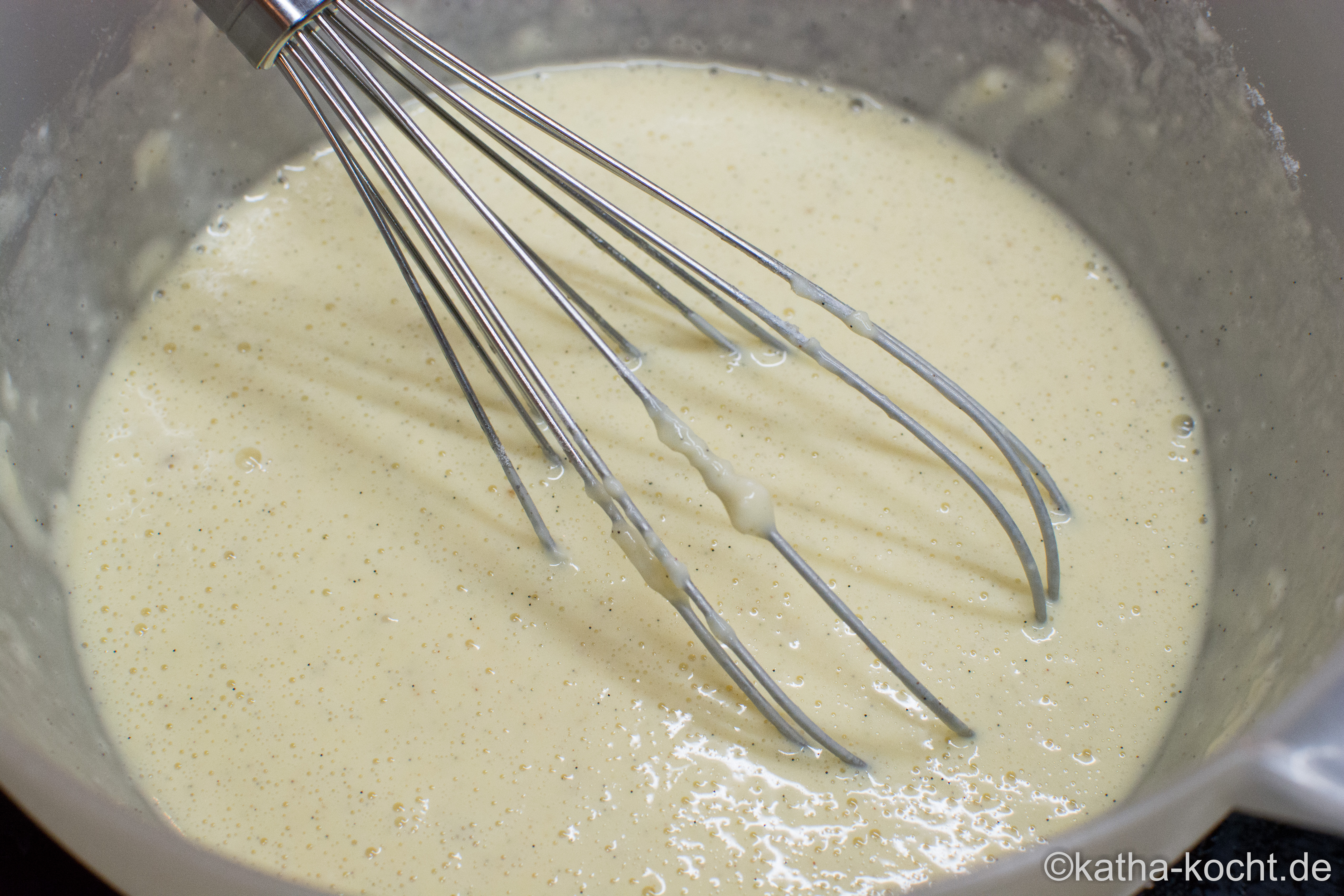 Die Milch mit Zimt, Ingwerpulver und dem Mark der Vanilleschote in einem kleinen Topf erwärmen bis sie dampft. Den Topf vom Herd nehmen und die Butter einrühren. Das Ganze kurz abkühlen lassen…