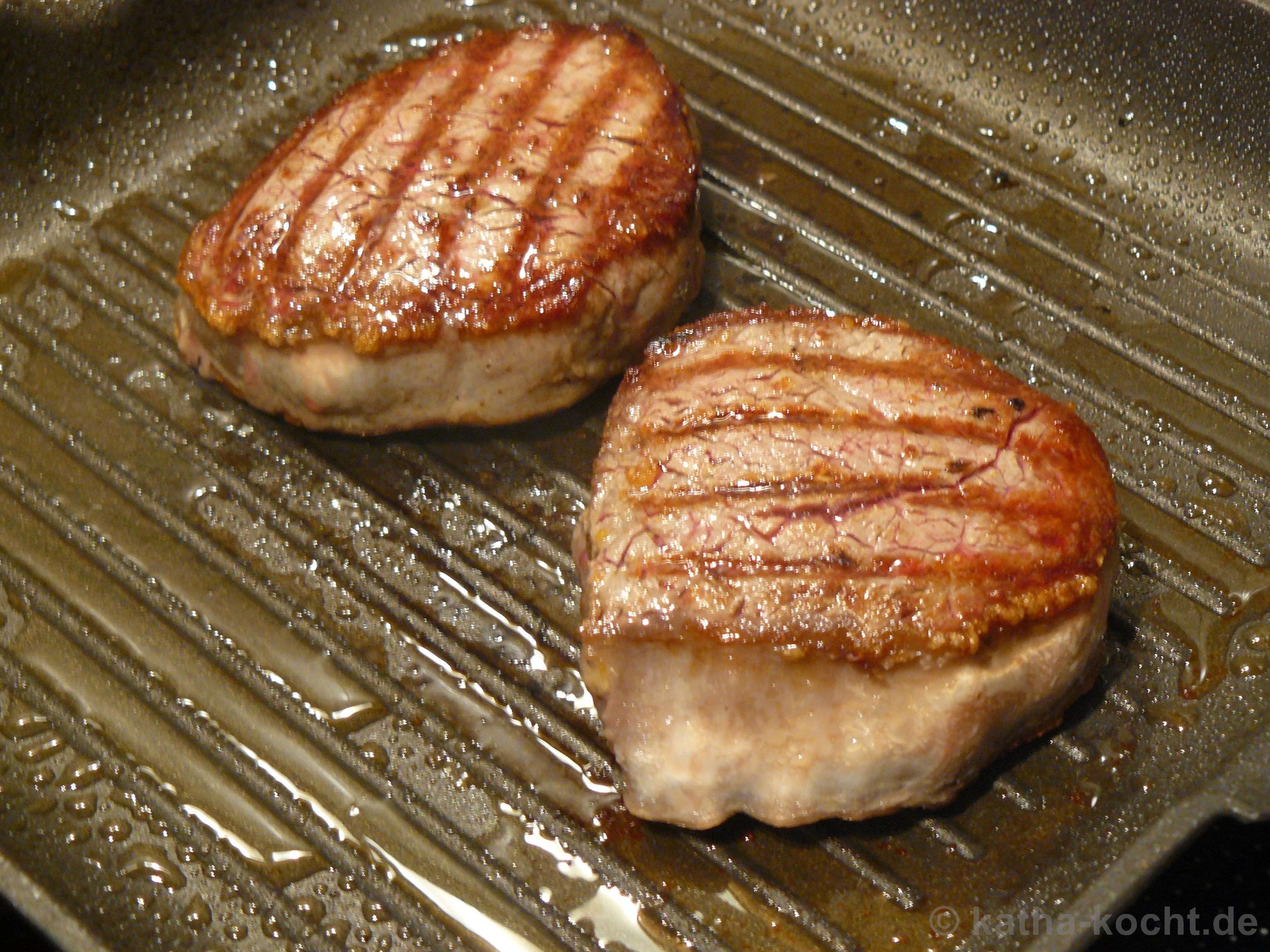 etwas Olivenöl und brate die Medaillons rundherum scharf an. Die Hitze wird reduziert und ich brate das Rinderfilet von jeder Seite knapp 4 Minuten. Kurz vor Ende würze ich es mit dem Erdbeerpfeffer.