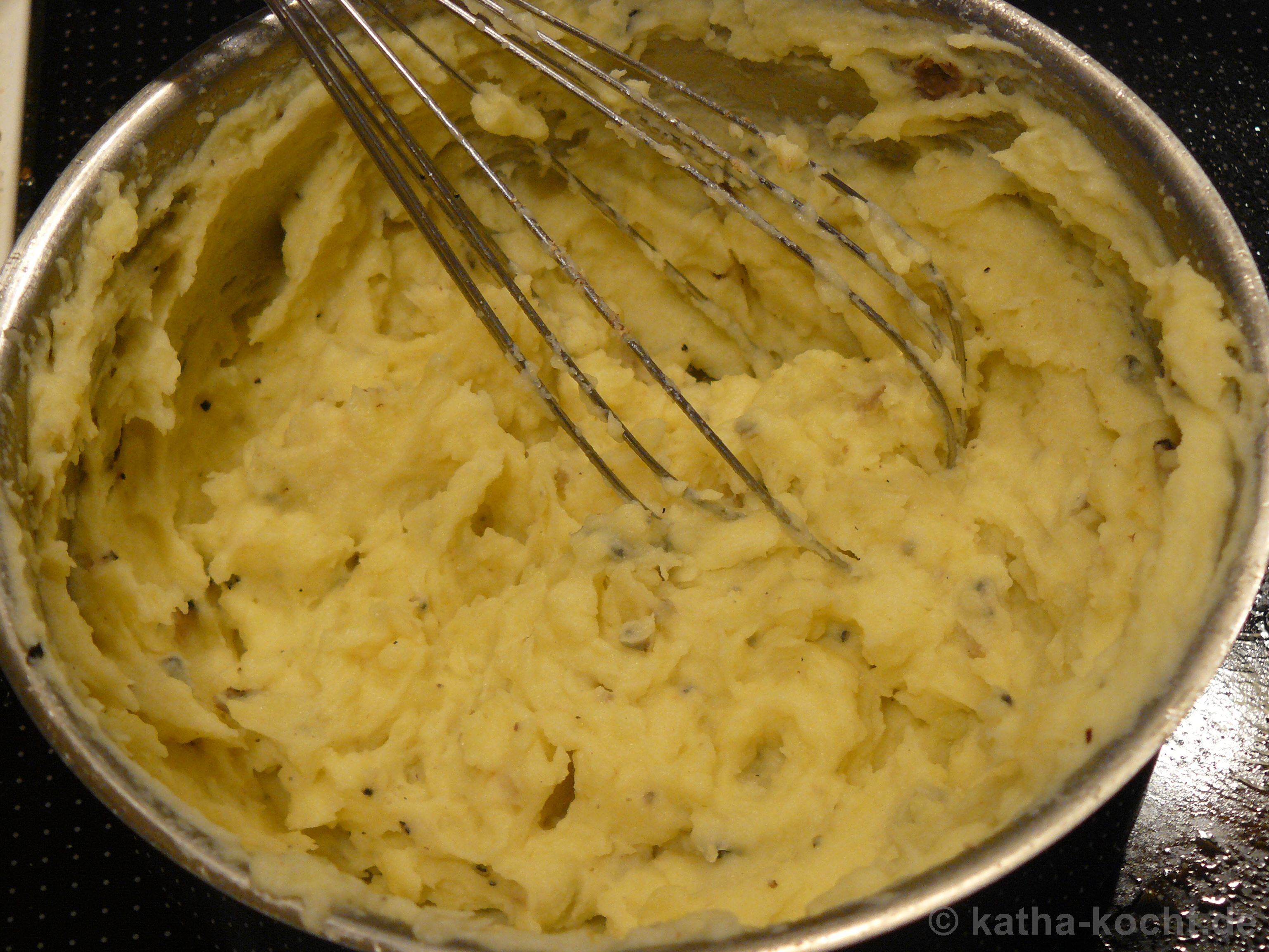 Wenn sie soweit sind gieße ich die Kartoffeln ab und stampfe sie. Dann rühre ich mit dem Schneebesen die Butter unter. Mit Pfeffer und Salz abschmecken. Dann hacke ich die Trüffelscheibchen fein und rühre die Trüffel und das Trüffelöl unter das Kartoffelpüree. Es duftet einfach wunderbar.