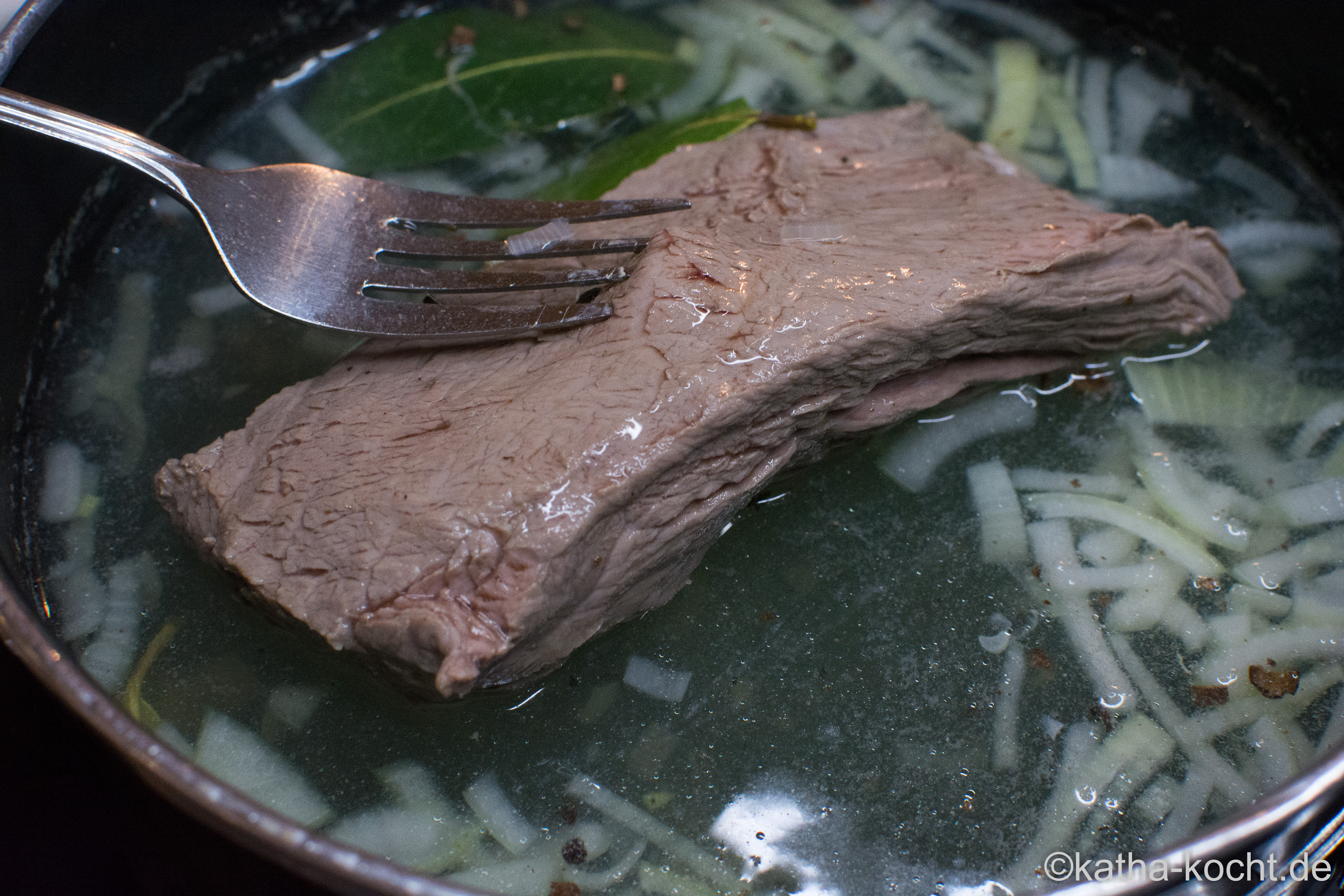 Die zwei Zwiebeln schälen, halbieren und in dünne Scheiben aufschneiden. Die Pimentkörner im Mörser zerstoßen und zusammen mit den Zwiebeln und den Lorbeerblättern in einen Topf mit Salzwasser geben. Aufkochen und das Fleisch hinein geben. Das Rindfleisch knapp eine Stunde sieden lassen – nicht kochen, sobald es anfängt zu sprudeln unbedingt die Temperatur reduzieren, sonst wird es schnell zäh. Dann die Hitze vollständig ausstellen und die Suppe abgedeckt 1,5 Stunden lang bei Raumtemperatur abkühlen lassen.