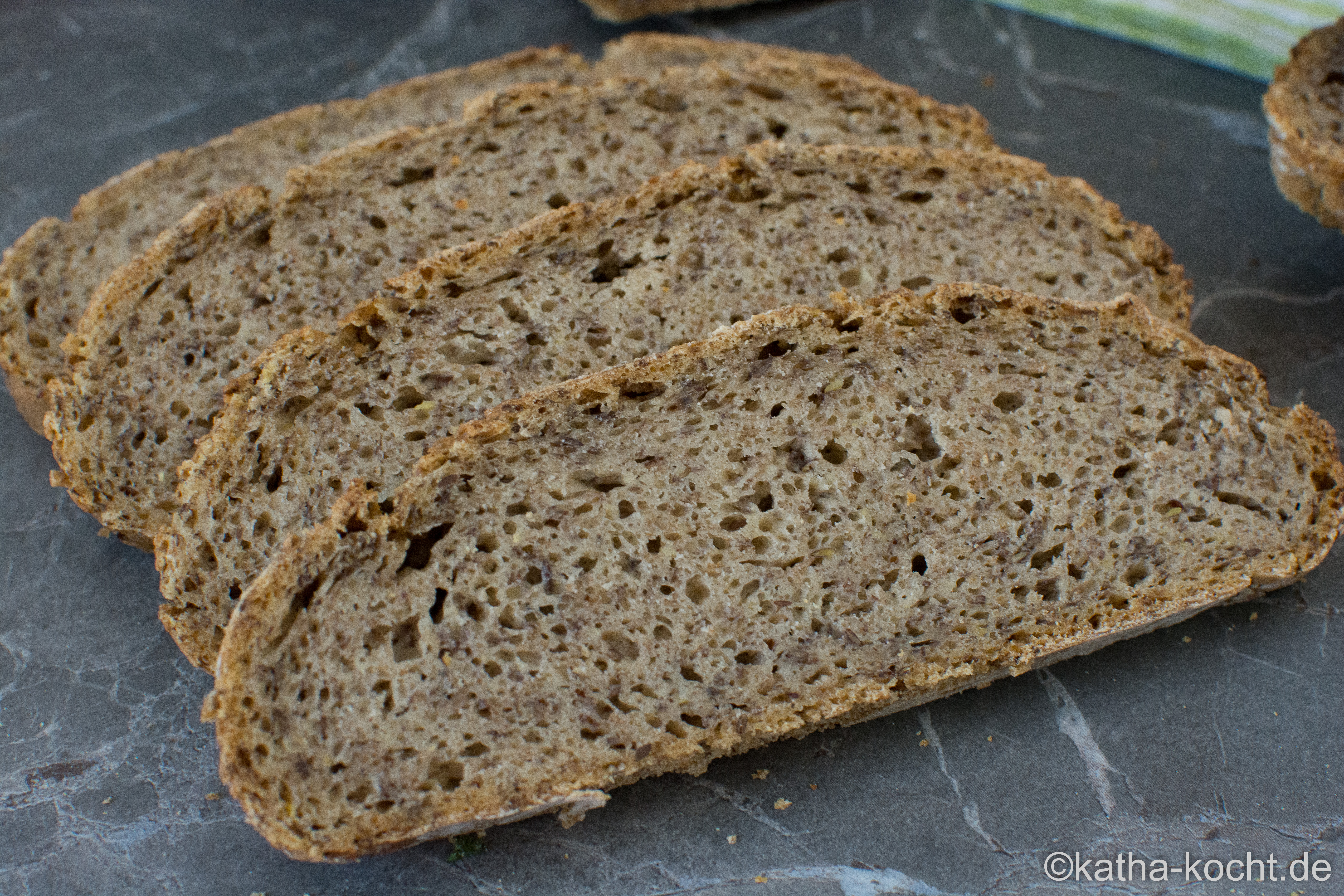 Das Brot an sich ist recht einfach gemacht, es hat eine hauchdünne und super knusprige und aromatische Kruste und eine weiche, luftige und durch die Leinsamenflocken trotzdem leicht kernige Krume.