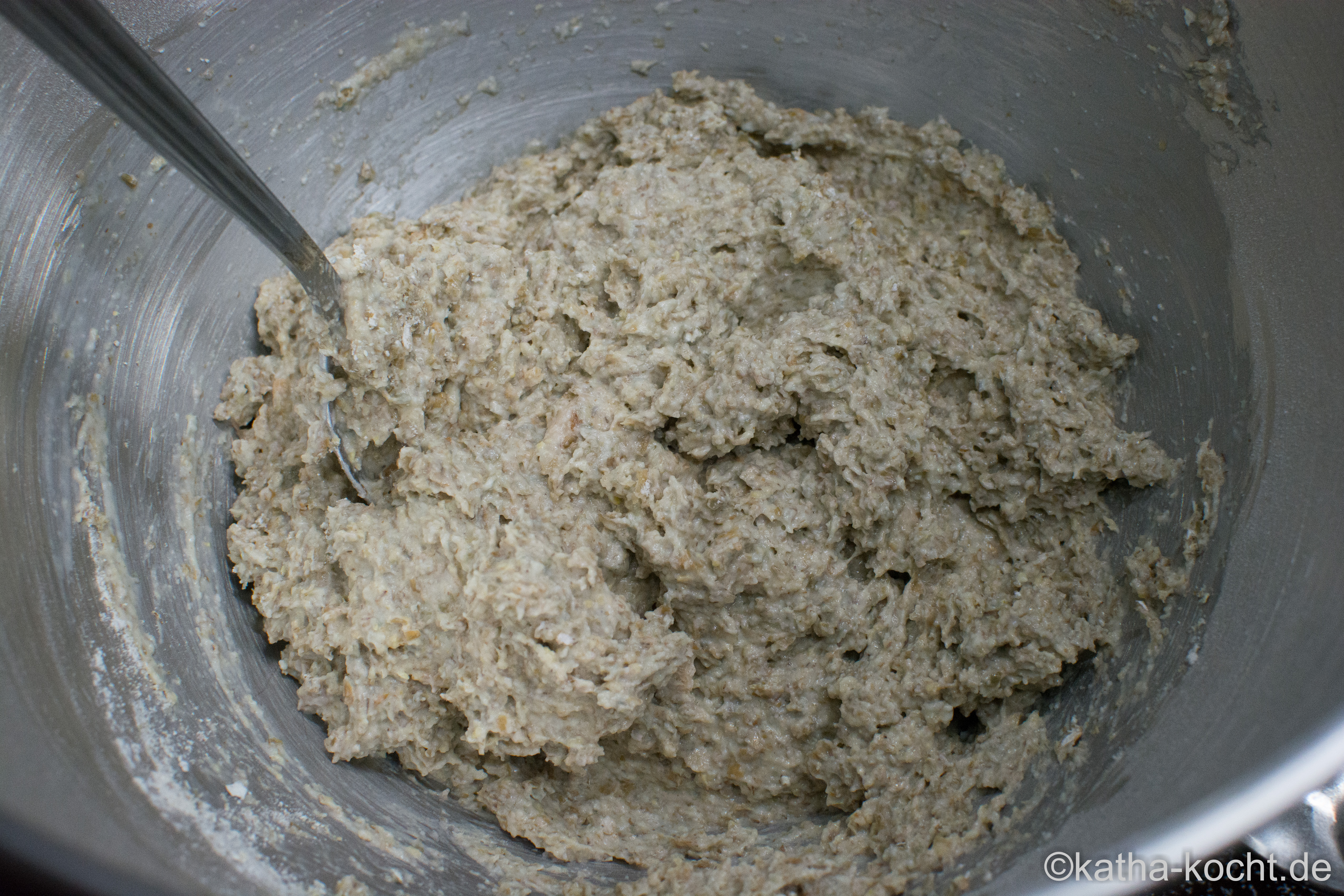 Alle Zutaten für den Vorteig mit der Gabel vermengen und 5 Stunden lang abgedeckt bei Raumtemperatur gehen lassen.