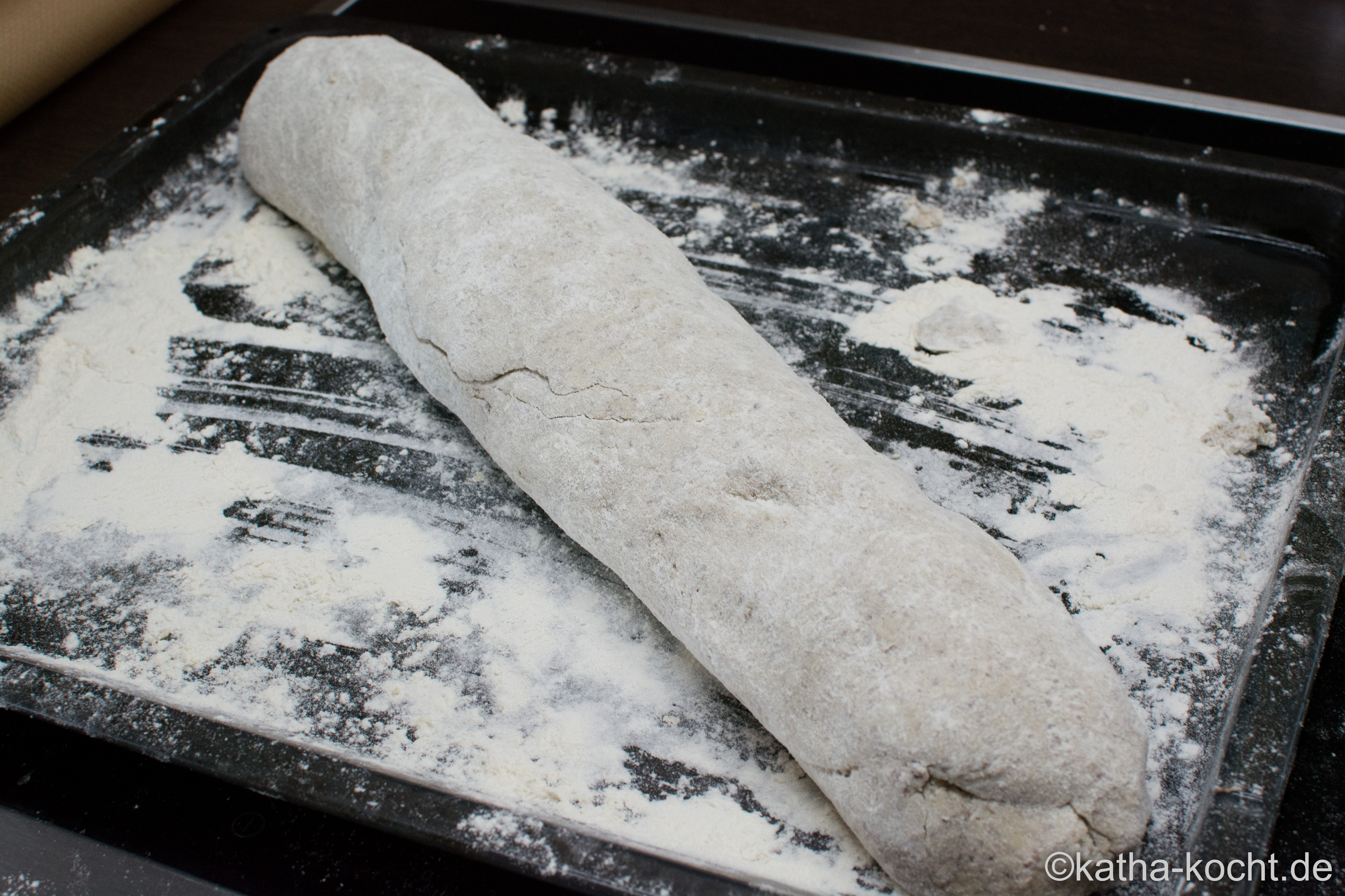 Den Teig auf der bemehlten Arbeitsfläche mehrfach falten und zu einem länglichen Laib formen. Rundum mit Mehl einreiben und direkt auf dem (leicht mit Mehl bestäubten Backblech) nochmal 2 Stunden bei Raumtemperatur gehen lassen.