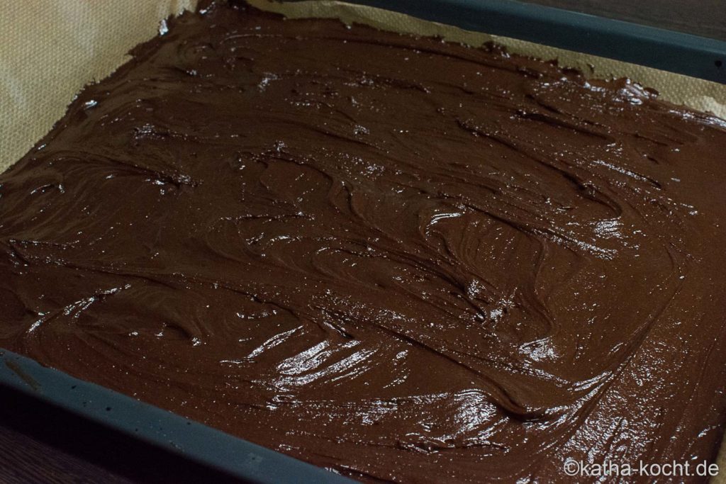 Die Butter und die Schokolade gemeinsam bei kleiner Hitze in einem Topf schmelzen. Den Zucker einrühren und alles ein wenig abkühlen lassen. Die Masse in die Rührschüssel der Küchenmaschine geben. Dann nacheinander die Eier einrühren, dazwischen ungefähr 20 Sekunden Abstand lassen. Mehl Kakao und Backpulver vermengen und dazu geben. Am Ende die Schlagsahne unterheben.