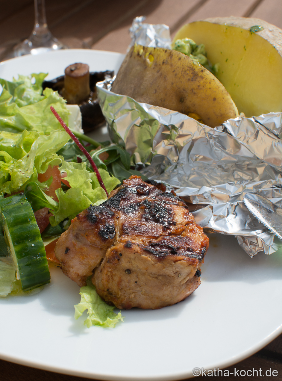 Die Schweinemedaillons zusammen mit den Folienkartoffeln und den Pilzen vom Grill nehmen. Salat und Kräuterbutter stelle ich einfach auf den Tisch – das kann sich dann jeder nach Lust und Laune selber nehmen.