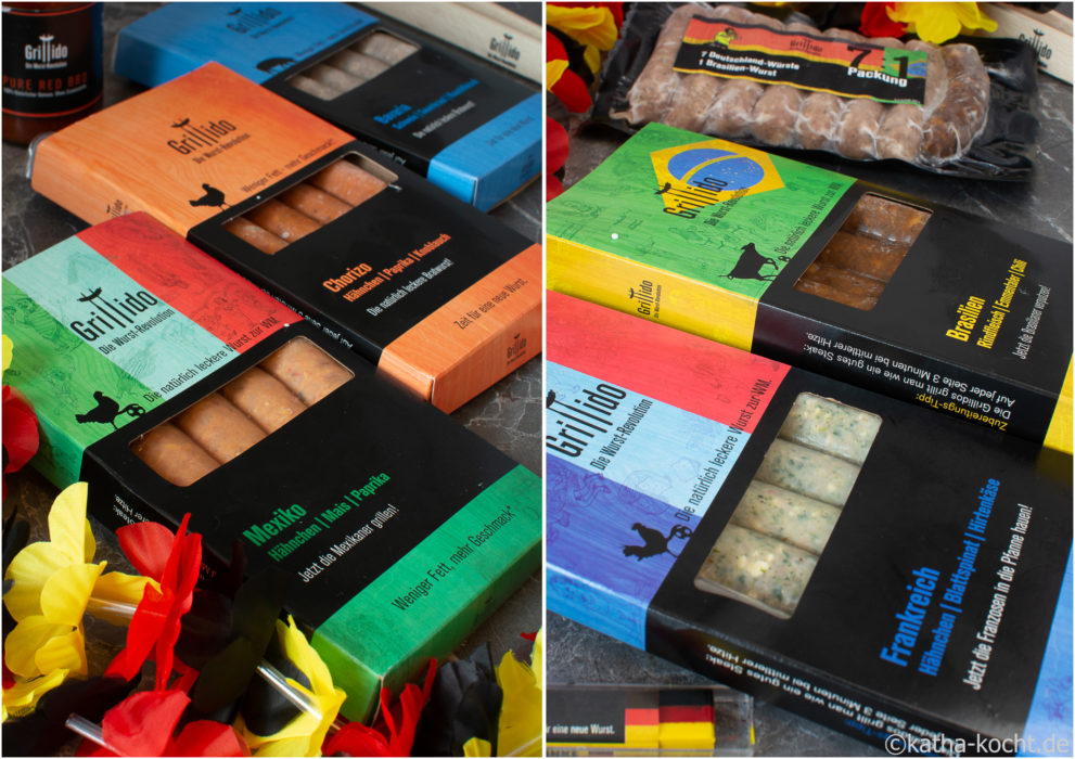 In Berlin haben wir dieses Jahr wirklich Glück und der Sommer verwöhnt uns mit bestem Grillwetter. Ganz klar, dass wir da auch zu dem WM Spielen den Grill anheizen. Und als ich gefragt wurde ob ich Lust hätte beim „Grillfest der Nationen“ von Grillido** dabei zu sein und die „Wurst gewordenen“ Top Teams auf den Grill zu werfen waren wir sofort dabei. Deutschland, Brasilien, Frankreich, Mexiko und Spanien wurden von Grillido ausgewählt und kulinarisch passend interpretiert. Nun sind Bratwürste ja eigentlich im Moment für mich nicht das Grillgut der Wahl, da sie in der Regel sehr fettig sind – aber die Grillido Würste punkten mit fettreduzierten (nur 6% Fett), proteinreichen Würsten für die das Fleisch von regionalen Erzeugern bezogen wird. Die Würste kommen ohne Zusatzstoffe oder chemische Bindemittel aus und sind dafür voll mit tollen natürlichen Zutaten. Als ich dann gesehen habe wie wenige Weight Watchers Punkte gerade die Geflügelwürste haben war es um mich geschehen. Und wer die Qual der Wahl hat wählt einfach einen bunten Mix – und so sind die Mexikaner mit Hähnchen, Mais und Chili, die Franzosen mit Hähnchen, Blattspinat und Hirtenkäse, die Brasilianer mit geräuchertem Rindfleisch, Emmentaler, Chili und Knoblauch, die Spanier mit Hähnchen und Chorizo und natürlich wir Deutschen mit Schweinefleisch, Rauchfleisch und Sauerkraut allesamt auf den Grill gewandert.