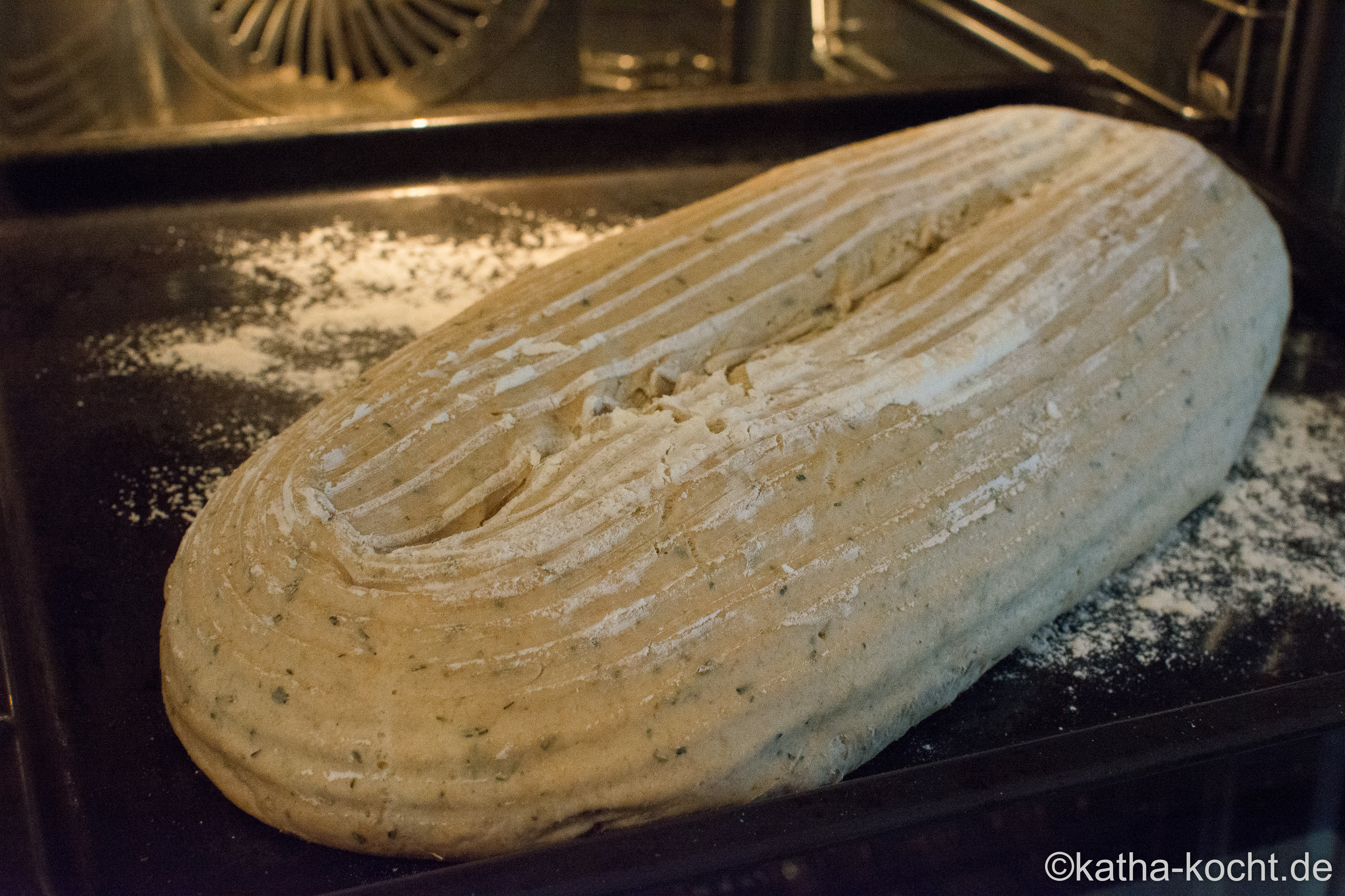 Auf das untere Blech gut 500ml heißes Wasser kippen, das sorgt für den Dampf. Wer einen Brotbackmodus im Ofen hat kann diesen Schritt natürlich weglassen. Das Brot braucht jetzt im Ofen auf mittlerer Schiene in etwa 45 Minuten. Nach 10-15 Minuten einmal Dampf ablassen und die Temperatur auf 180°C reduzieren.