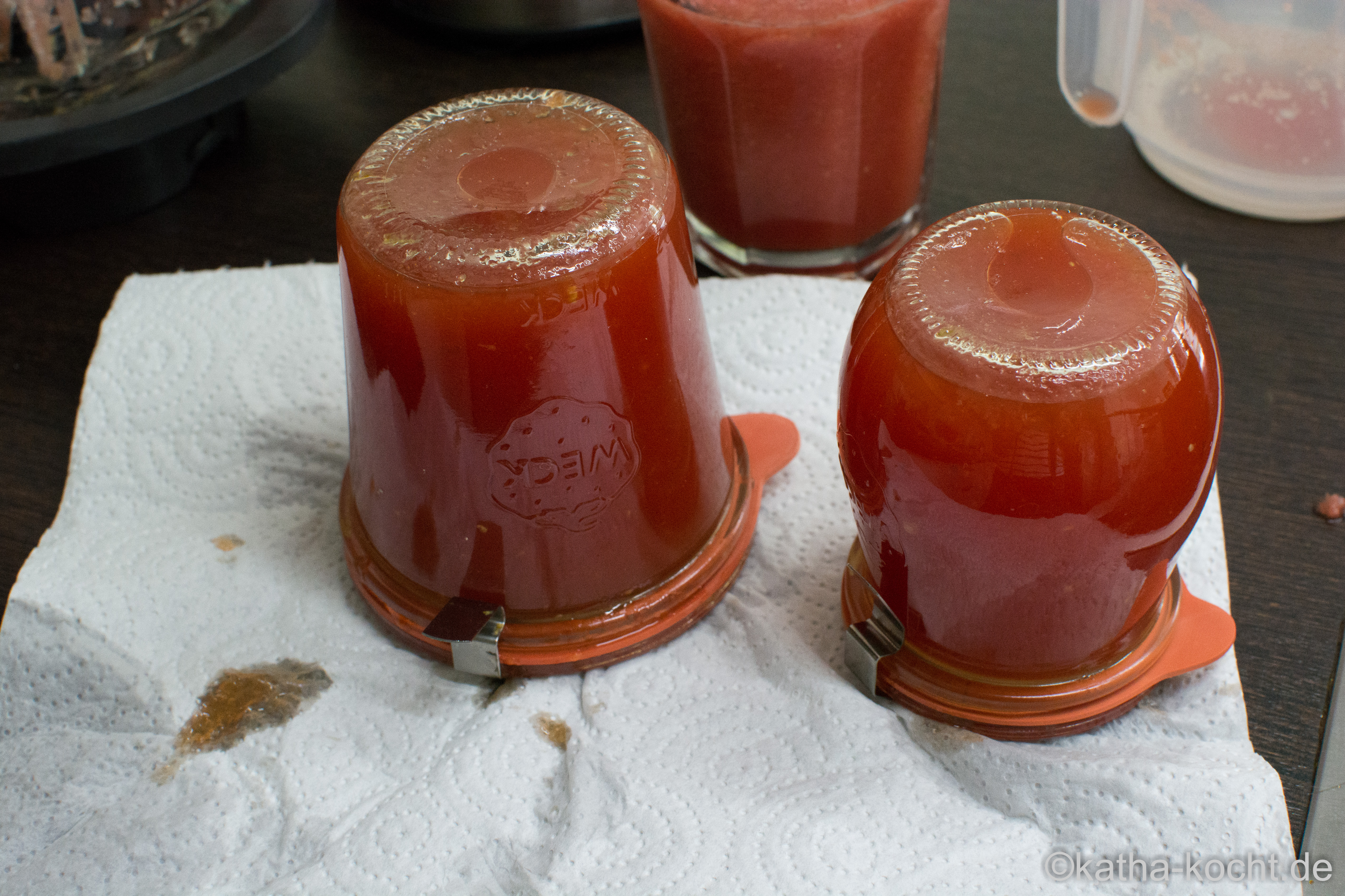 Ausreichend Wasser im Wasserkocher erhitzen und in die Einweckgläser* füllen. Den Dichtungsgummi einfach im Glas versenken und die Deckel kurz übergießen. 2-3 Minuten stehen lassen, abgießen und umgedreht auf etwas Haushaltspapier abtropfen lassen.